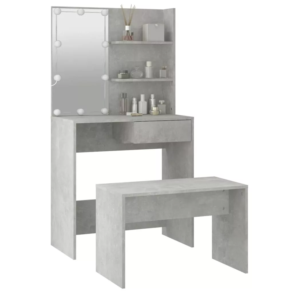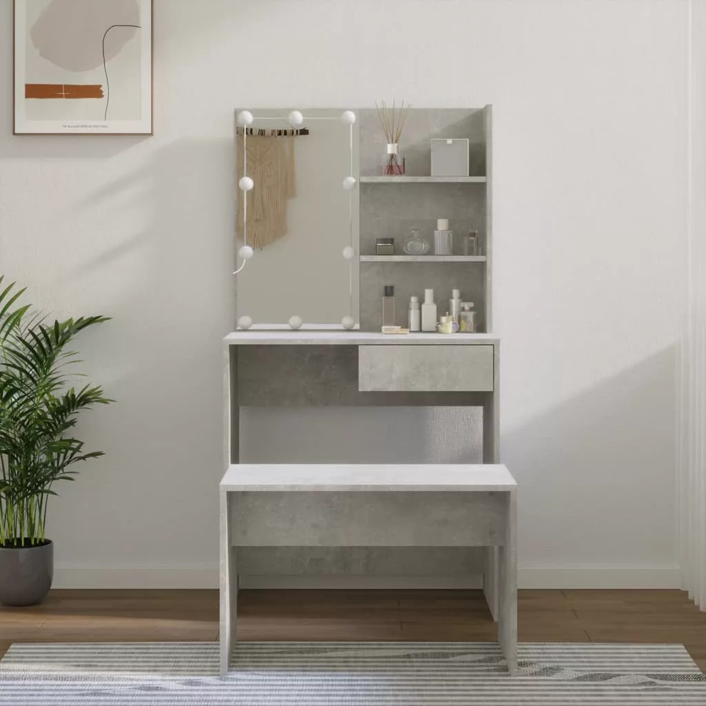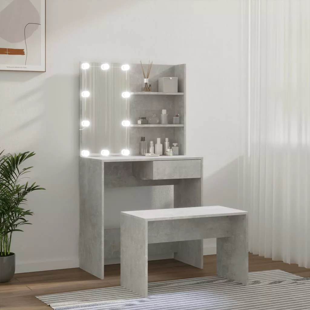 betonszürke szerelt fa fésülködőasztal-szett LED-ekkel