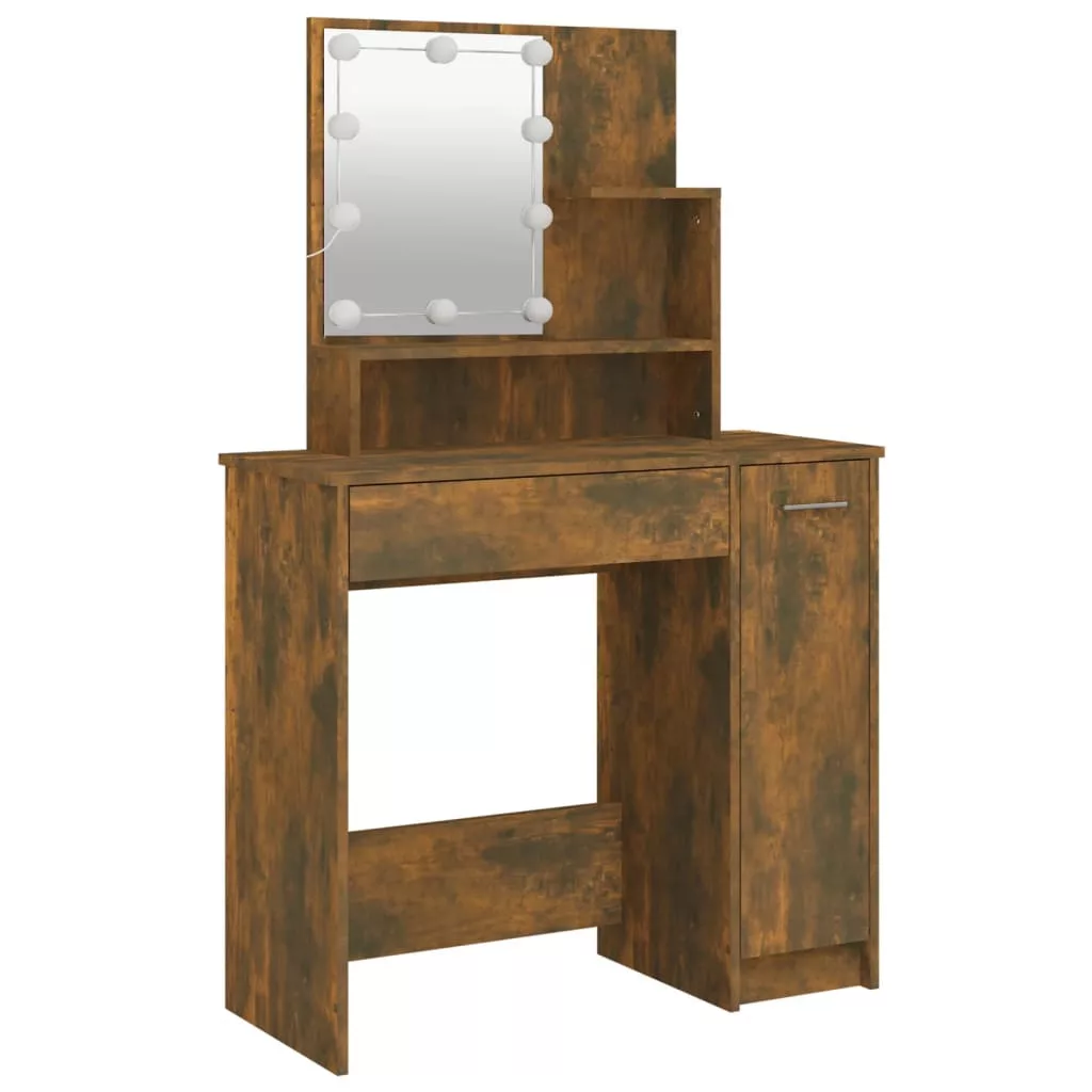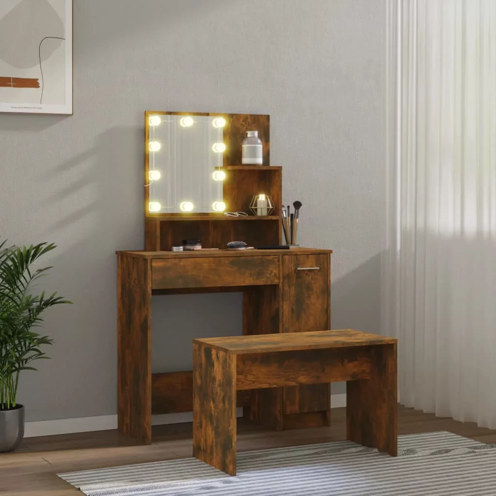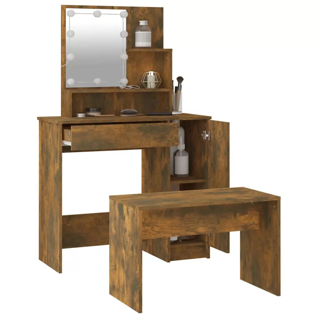 füstös tölgyszínű szerelt fa fésülködőasztal-szett LED-ekkel