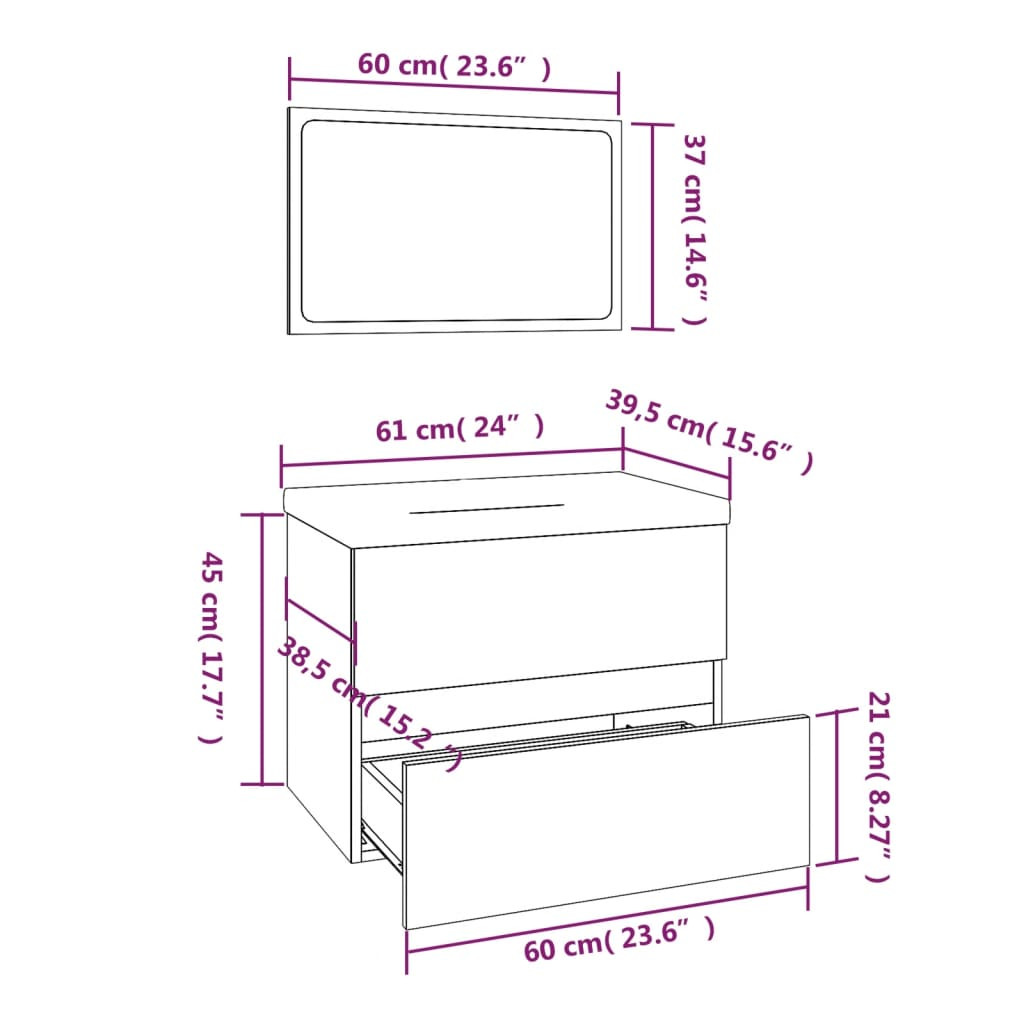 Ez a tágas tárolóhellyel rendelkező, stílusos fürdőszobaszekrény-garnitúra fürdőszobája nagyszerű kiegészítője lesz, rendezett és lenyűgöző megjelenést kölcsönözve neki! Masszív anyag: A mosdó alatti szekrény szerelt fából készült, ami kivételes minőségű, sima felületű, szilárd, stabil, és ellenáll a nedvességnek.Bőséges tárolóhely: A fürdőszobai mosdóegység egy fiókkal rendelkezik, amely bőséges helyet biztosít a fürdőszobában lévő holmik tárolására.Praktikus kialakítás: A fürdőszobaszekrény teteje ideális a mosdókagyló elhelyezésére.Falra szerelhető: A fürdőszobaszekrény és a sminktükör falra szerelhető, így extra tárolóhelyet biztosít. Ezáltal maximalizálhatja a padlóterületet, és tisztán tarthatja a környezetét.Túlfolyófunkció: Túlfolyóval is rendelkezik, hogy kifolyjon a víz, ha a mosdó túlságosan megtelik. Megjegyzés:A falon belüli csavar(ok) és dugó(k) nem alaptartozékok. Keressen és használjon a falának megfelelő csavar(oka)t és dugó(ka)t. Ha bizonytalan, kérje szakember tanácsát. Gondosan olvassa el és kövesse a használati utasítás minden lépését.Figyelem: a szállítás a csapot és a lefolyót nem tartalmazza.Az egyszerű összeszerelés érdekében minden termékhez mellékelünk összeszerelési útmutatót. A gyermekeket felügyelni kell, hogy ne játsszanak a készülékkel. Tartsa távol a gyerekeket az összeszerelési területtől. Figyelem: Használat előtt figyelmesen olvassa el az utasításokat, és őrizze meg további hivatkozás céljából.