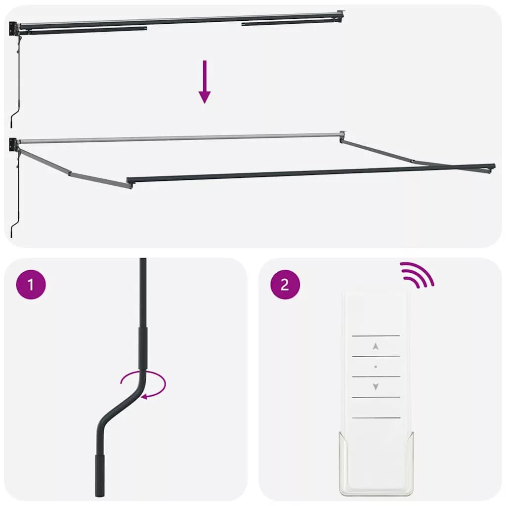 Élvezzen egy hűsítő italt, pár finom falatot vagy beszélgessen egy jót a teraszán a barátaival, miközben e csodálatos, automatikusan behúzható napellenző alatt pihen! Tartós anyag: A napellenző váza porszórt alumíniumból készült, amely robusztus és tartós. A PU felületkezeléssel ellátott szövet UV-álló. Óvja családját vagy vendégeit az UV-sugárzástól és a vakító napfénytől.Behúzható napellenző: A kerti árnyékoló behúzható, hogy megfeleljen az Ön különböző igényeinek. Kihúzva hűsítő árnyékot nyújt, összehúzva pedig nem akadályozza a kilátást.Könnyű kezelhetőség: A mellékelt távirányítóval könnyedén kinyithatja és visszahúzhatja a kerti napellenzőt. Ezenkívül a hosszú kézzel kezelhető karral zökkenőmentesen tudja irányítani a kültéri ernyőt, ha nincs áram. Ennek a behúzható napellenzőnek az összeszerelése egyszerű.Falra szerelhető kivitel: A terasz napellenző a mellékelt fali tartókkal egyszerűen a falra szerelhető, és nem foglal el semmilyen alapterületet.Széleskörű alkalmazás: Az elektromos napellenző egyszerű és stílusos kialakítású, amely jól illeszkedik otthoni vagy kereskedelmi környezetébe. Különféle helyekre alkalmas, például erkélyre, teraszra, udvarra, éttermekbe, kávézókba, üzletekbe stb. Ez a készülék 8 éves vagy annál idősebb gyermekek, valamint csökkent fizikai, érzékszervi vagy mentális képességekkel rendelkező személyek, vagy tapasztalatlanok és tudás híján lévők számára is használható, ha megfelelő felügyeletet kaptak, vagy útmutatást kaptak a készülék biztonságos használatáról, és megértik a vele járó veszélyeket. A gyermekek nem játszhatnak a készülékkel. A tisztítást és karbantartást a gyermekek nem végezhetik felügyelet nélkül. Ha a tápkábel sérült, azt a gyártónak, annak szervizügynökének vagy hasonlóan képzett személynek kell kicserélnie, hogy elkerülje a veszélyeket. FIGYELEM: Fontos biztonsági utasítások. Az emberek biztonsága érdekében fontos, hogy kövessük ezeket az utasításokat. Őrizze meg ezeket az utasításokat. FIGYELEM: Fontos biztonsági utasítások. Kövesse az összes utasítást, mivel a helytelen telepítés súlyos sérüléshez vagy akár halálhoz vezethet. Ne engedje, hogy gyermekek játsszanak a vezérlő eszközzel. Tartsa a távirányítót távol a gyermekektől. Ne működtesse a napernyőt, miközben karbantartást, például ablakmosást végeznek a közelben. A meghajtó mozgó alkatrészeit legalább 2,5 m magasságban kell telepíteni a padlóról, vagy más olyan szinten, amely hozzáférést biztosíthat hozzájuk. A meghajtó telepítése előtt távolítsa el az összes felesleges vezetéket, és kapcsolja ki azokat az eszközöket, amelyek nem szükségesek a működtetéshez. Az eltorzított kikapcsoló kapcsoló működtető eleme közvetlen látótávolságon belül legyen a meghajtott részhez, de távol a mozgó alkatrészektől. Minimum 1,5 m magasságban kell telepíteni.A gyermekeket felügyelni kell, hogy ne játsszanak a készülékkel. Tartsa távol a gyerekeket az összeszerelési területtől. Figyelem: Használat előtt figyelmesen olvassa el az utasításokat, és őrizze meg további hivatkozás céljából.Veszély! Kinyitáskor a rugó erősen kipattan. NE távolítsa el a kötelet addig, amíg az összes összeszerelési lépést be nem fejezte, az összes csavart nem rögzítette és az elem nincs a falhoz rögzítve! Figyelem! Legyen óvatos a karok kilazításakor, mert azok feszültség alatt állnak! Az összecsukható kar hirtelen kiengedése sérülést okozhat. Figyelmeztetés: A termék használata előtt el kell olvasni a használati útmutatót. Figyelem: A fagyos körülmények között történő használat kárt tehet a termékben. Külső felhasználás épületeknél és egyéb építkezéseknél.