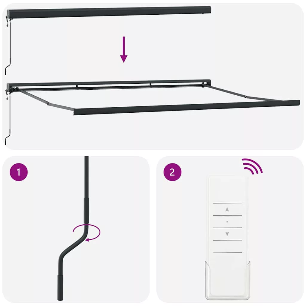 Élvezzen egy hűsítő italt, pár finom falatot vagy beszélgessen egy jót a teraszán a barátaival, miközben e csodálatos behúzható napellenző alatt pihen! Strapabíró anyag: A terasz napellenző váza porszórt alumíniumból készült, amely robusztus és tartós. A PU felületkezeléssel ellátott szövet UV-álló. Óvja családját vagy vendégeit az UV-sugárzástól és a vakító napfénytől.Behúzható funkció: Az ablak napellenző behúzható, hogy megfeleljen az Ön különböző igényeinek. Kihúzva hűsítő árnyékot nyújt, összehúzva pedig nem akadályozza a kilátást.Falra szerelhető kivitel: A terasz napellenző a mellékelt fali tartókkal egyszerűen a falra szerelhető, és nem foglal el semmilyen alapterületet.Széleskörű alkalmazás: A motoros napellenző egyszerű és stílusos dizájnnal rendelkezik, amely jól illeszkedik otthoni vagy kereskedelmi környezetbe. Különféle helyeken használható, például erkélyen, teraszon, udvaron, éttermekben, kávézókban, üzletekben... stb. Ez a készülék 8 éves vagy annál idősebb gyermekek, valamint csökkent fizikai, érzékszervi vagy mentális képességekkel rendelkező személyek, vagy tapasztalatlanok és tudás híján lévők számára is használható, ha megfelelő felügyeletet kaptak, vagy útmutatást kaptak a készülék biztonságos használatáról, és megértik a vele járó veszélyeket. A gyermekek nem játszhatnak a készülékkel. A tisztítást és karbantartást a gyermekek nem végezhetik felügyelet nélkül. Ha a tápkábel sérült, azt a gyártónak, annak szervizügynökének vagy hasonlóan képzett személynek kell kicserélnie, hogy elkerülje a veszélyeket. FIGYELEM: Fontos biztonsági utasítások. Az emberek biztonsága érdekében fontos, hogy kövessük ezeket az utasításokat. Őrizze meg ezeket az utasításokat. FIGYELEM: Fontos biztonsági utasítások. Kövesse az összes utasítást, mivel a helytelen telepítés súlyos sérüléshez vagy akár halálhoz vezethet. Ne engedje, hogy gyermekek játsszanak a vezérlő eszközzel. Tartsa a távirányítót távol a gyermekektől. Ne működtesse a napernyőt, miközben karbantartást, például ablakmosást végeznek a közelben. A meghajtó mozgó alkatrészeit legalább 2,5 m magasságban kell telepíteni a padlóról, vagy más olyan szinten, amely hozzáférést biztosíthat hozzájuk. A meghajtó telepítése előtt távolítsa el az összes felesleges vezetéket, és kapcsolja ki azokat az eszközöket, amelyek nem szükségesek a működtetéshez. Az eltorzított kikapcsoló kapcsoló működtető eleme közvetlen látótávolságon belül legyen a meghajtott részhez, de távol a mozgó alkatrészektől. Minimum 1,5 m magasságban kell telepíteni.Veszély! Kinyitáskor a rugó erősen kipattan. NE távolítsa el a kötelet addig, amíg az összes összeszerelési lépést be nem fejezte, az összes csavart nem rögzítette és az elem nincs a falhoz rögzítve! Figyelem! Legyen óvatos a karok kilazításakor, mert azok feszültség alatt állnak! Az összecsukható kar hirtelen kiengedése sérülést okozhat. Figyelmeztetés: A termék használata előtt el kell olvasni a használati útmutatót. Figyelem: A fagyos körülmények között történő használat kárt tehet a termékben. Külső felhasználás épületeknél és egyéb építkezéseknél. A védelem nélküli mozgó alkatrészeket a padlószinttől – vagy más olyan szinttől, ahonnan hozzáférhető – 2,5 méternél magasabbra kell felszerelni.