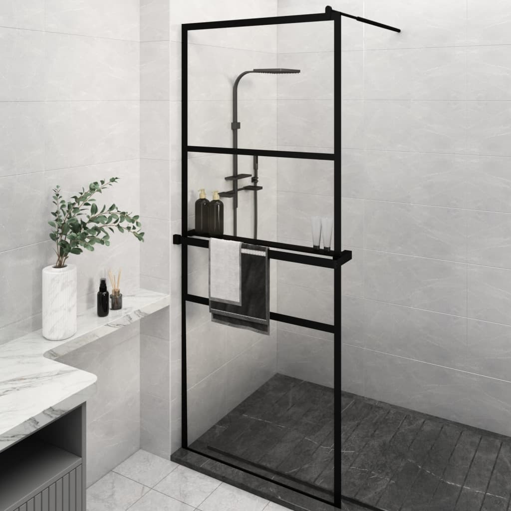 fekete ESG üveg és alumínium zuhanyfal polccal 80 x 195 cm
