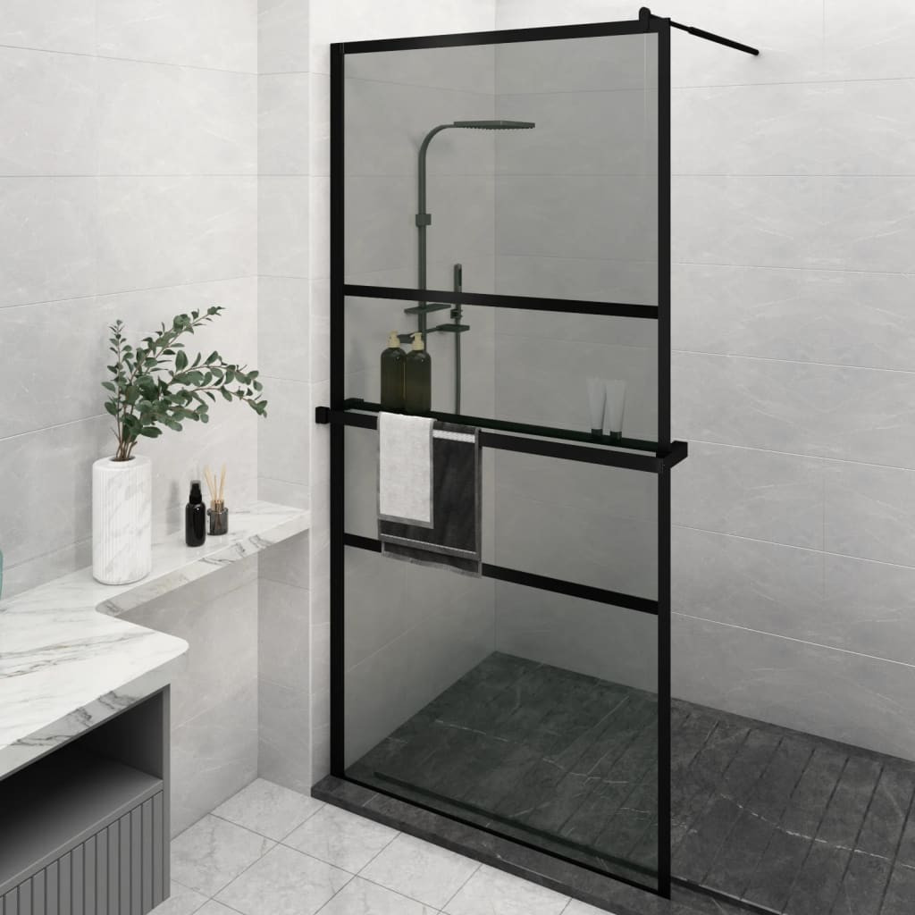 fekete ESG üveg és alumínium zuhanyfal polccal 115x195 cm