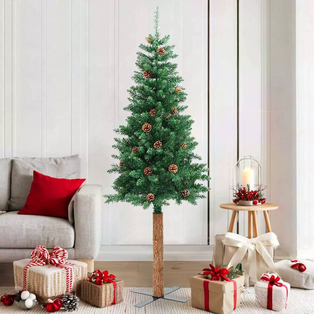zöld PVC vékony karácsonyfa valódi fával és tobozzal 180 cm