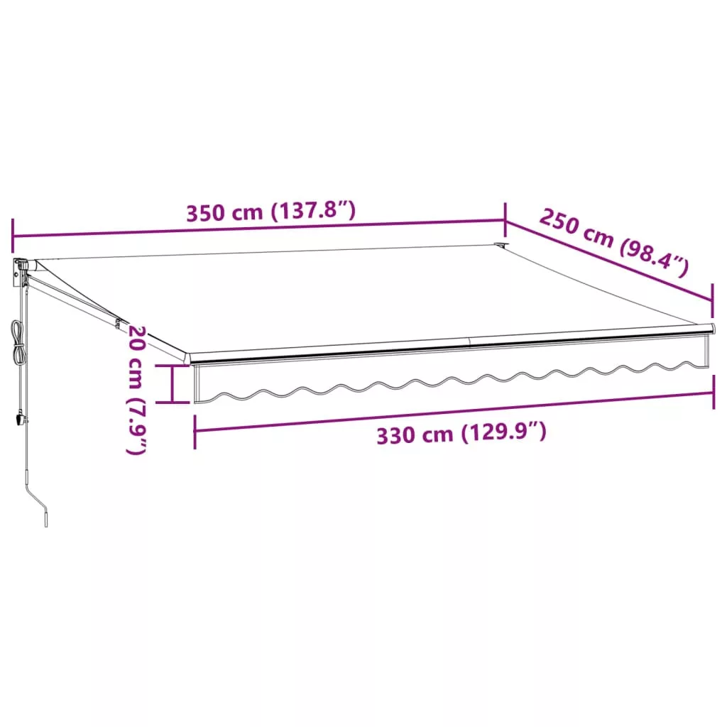 Teremtsen kellemes és hűvös helyet a teraszon, és védje meg magát az UV-sugaraktól ezzel a kihúzható napellenzővel! Tartós anyag: A napellenző váza porszórt alumíniumból készült, amely robusztus és tartós. A PU felületkezeléssel ellátott szövet UV-álló. Óvja családját vagy vendégeit az UV-sugárzástól és a vakító napfénytől.Automata funkció: A napellenzőt a mellékelt távirányítóval könnyedén kinyithatja és visszahúzhatja.Könnyen kezelhető: A szög és a magasság állítható, hogy megfeleljen az Ön különböző igényeinek. A napellenző a hosszú hajtókarral zökkenőmentesen nyitható és visszahúzható.Széleskörű alkalmazás: Ez a kihúzható napellenző egyszerű, stílusos kialakítású, amely jól illeszkedik otthoni vagy kereskedelmi környezetébe. Különféle helyekre alkalmas, például erkélyre, teraszra, udvarra, éttermekbe, kávézókba, üzletekbe stb. Veszély! Kinyitáskor a rugó erősen kipattan. NE távolítsa el a kötelet addig, amíg az összes összeszerelési lépést be nem fejezte, az összes csavart nem rögzítette és az elem nincs a falhoz rögzítve! Figyelem! Legyen óvatos a karok kilazításakor, mert azok feszültség alatt állnak! Az összecsukható kar hirtelen kiengedése sérülést okozhat. Figyelmeztetés: A termék használata előtt el kell olvasni a használati útmutatót. Figyelem: A fagyos körülmények között történő használat kárt tehet a termékben. Külső felhasználás épületeknél és egyéb építkezéseknél. Ne engedje, hogy a gyerekek a redőny vezérlőeszközével játszanak. Tartsa a távirányítót távol a gyermekektől.