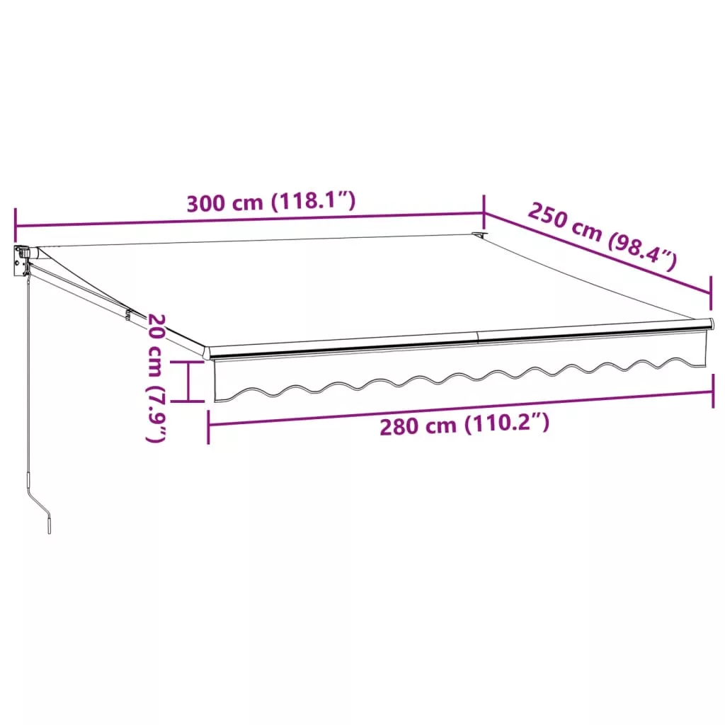 Élvezzen egy hűsítő italt, pár finom falatot vagy beszélgessen egy jót a teraszán a barátaival, miközben e csodálatos behúzható napellenző alatt pihen! Tartós anyag: A napellenző váza porszórt alumíniumból készült, amely robusztus és tartós. A PU felületkezeléssel ellátott szövet UV-álló. Óvja családját vagy vendégeit az UV-sugárzástól és a vakító napfénytől.Behúzható napellenző: A kerti árnyékoló behúzható, hogy megfeleljen az Ön különböző igényeinek. Kihúzva hűsítő árnyékot nyújt, összehúzva pedig nem akadályozza a kilátást.Falra szerelhető kivitel: A terasz napellenző a mellékelt fali tartókkal egyszerűen a falra szerelhető, és nem foglal el semmilyen alapterületet.Széleskörű alkalmazás: A behúzható napellenző egyszerű és stílusos kialakítású, amely jól illeszkedik otthoni vagy kereskedelmi környezetébe. Különféle helyekre alkalmas, például erkélyre, teraszra, udvarra, éttermekbe, kávézókba, üzletekbe stb. A gyermekeket felügyelni kell, hogy ne játszhassanak az eszközzel. Tartsd távol a gyermekeket a szerelési területtől. Figyelem: Olvasd el alaposan az utasításokat használat előtt, és tartsd meg későbbi hivatkozásra.