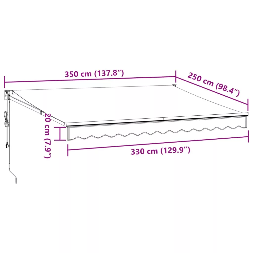 Élvezzen egy hűsítő italt, pár finom falatot vagy beszélgessen egy jót a teraszán a barátaival, miközben e csodálatos behúzható napellenző alatt pihen! Tartós anyag: A napellenző váza porszórt alumíniumból készült, amely robusztus és tartós. A PU felületkezeléssel ellátott szövet UV-álló. Óvja családját vagy vendégeit az UV-sugárzástól és a vakító napfénytől.Behúzható napellenző: A kerti árnyékoló behúzható, hogy megfeleljen az Ön különböző igényeinek. Kihúzva hűsítő árnyékot nyújt, összehúzva pedig nem akadályozza a kilátást.Falra szerelhető kivitel: A terasz napellenző a mellékelt fali tartókkal egyszerűen a falra szerelhető, és nem foglal el semmilyen alapterületet.Széleskörű alkalmazás: A behúzható napellenző egyszerű és stílusos kialakítású, amely jól illeszkedik otthoni vagy kereskedelmi környezetébe. Különféle helyekre alkalmas, például erkélyre, teraszra, udvarra, éttermekbe, kávézókba, üzletekbe stb. Ez a készülék 8 éves vagy annál idősebb gyermekek, valamint csökkent fizikai, érzékszervi vagy mentális képességekkel rendelkező személyek, vagy tapasztalatlanok és tudás híján lévők számára is használható, ha megfelelő felügyeletet kaptak, vagy útmutatást kaptak a készülék biztonságos használatáról, és megértik a vele járó veszélyeket. A gyermekek nem játszhatnak a készülékkel. A tisztítást és karbantartást a gyermekek nem végezhetik felügyelet nélkül. Ha a tápkábel sérült, azt a gyártónak, annak szervizügynökének vagy hasonlóan képzett személynek kell kicserélnie, hogy elkerülje a veszélyeket. FIGYELEM: Fontos biztonsági utasítások. Az emberek biztonsága érdekében fontos, hogy kövessük ezeket az utasításokat. Őrizze meg ezeket az utasításokat. FIGYELEM: Fontos biztonsági utasítások. Kövesse az összes utasítást, mivel a helytelen telepítés súlyos sérüléshez vagy akár halálhoz vezethet. Ne engedje, hogy gyermekek játsszanak a vezérlő eszközzel. Tartsa a távirányítót távol a gyermekektől. Ne működtesse a napernyőt, miközben karbantartást, például ablakmosást végeznek a közelben. A meghajtó mozgó alkatrészeit legalább 2,5 m magasságban kell telepíteni a padlóról, vagy más olyan szinten, amely hozzáférést biztosíthat hozzájuk. A meghajtó telepítése előtt távolítsa el az összes felesleges vezetéket, és kapcsolja ki azokat az eszközöket, amelyek nem szükségesek a működtetéshez. Az eltorzított kikapcsoló kapcsoló működtető eleme közvetlen látótávolságon belül legyen a meghajtott részhez, de távol a mozgó alkatrészektől. Minimum 1,5 m magasságban kell telepíteni.Veszély! Kinyitáskor a rugó erősen kipattan. NE távolítsa el a kötelet addig, amíg az összes összeszerelési lépést be nem fejezte, az összes csavart nem rögzítette és az elem nincs a falhoz rögzítve! Figyelem! Legyen óvatos a karok kilazításakor, mert azok feszültség alatt állnak! Az összecsukható kar hirtelen kiengedése sérülést okozhat. Figyelmeztetés: A termék használata előtt el kell olvasni a használati útmutatót. Figyelem: A fagyos körülmények között történő használat kárt tehet a termékben. Külső felhasználás épületeknél és egyéb építkezéseknél.