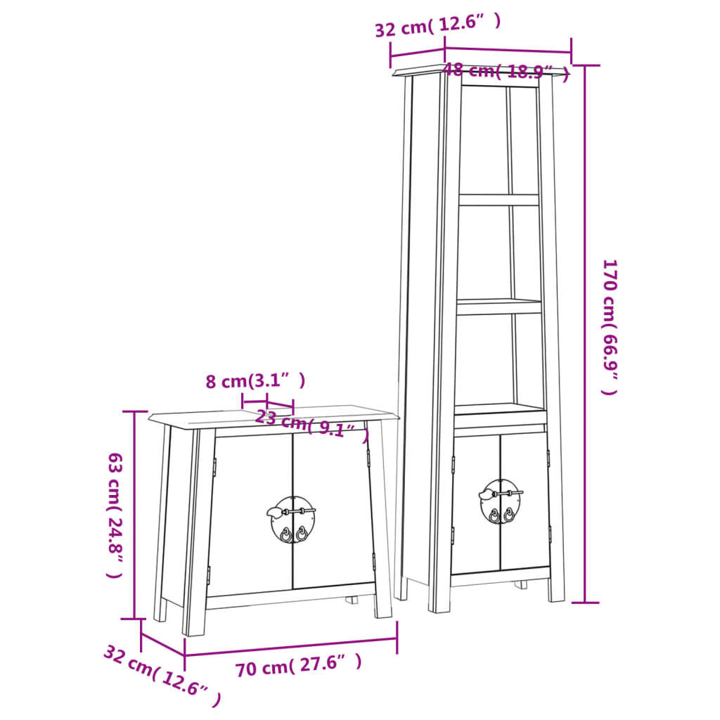 Ez a fürdőszobaszekrény-garnitúra fürdőszobája nagyszerű kiegészítője lesz, rendezett és lenyűgöző megjelenést kölcsönözve neki! Tömör fenyőfa: A tömör fenyőfa egy gyönyörű természetes anyag. A fenyőfa erezete egyenes, a csomók pedig jellegzetes, rusztikus megjelenést kölcsönöznek az anyagnak.Bőséges tárolóhely: A fürdőszobaszekrény bőséges helyet biztosít az alapvető pipere- és fürdőcikkek, például a szappanok, a sampon, a fogkrém stb. számára.Kényelmes fogantyúk: A fém fogantyúknak köszönhetően a fürdőszobai tárolószekrény egyszerű nyitható, így Ön mindig megtalálhatja, amit keres. Figyelem:A felborulás elkerülése érdekében ezt a terméket fali rögzítőeszközzel (nem tartozék) kell használni. Jó tudni:Minden termék egyedi, a szín és az erezet változik. A kiszállítás véletlenszerűen történik, biztosítva terméke exkluzivitását és egyediségét.