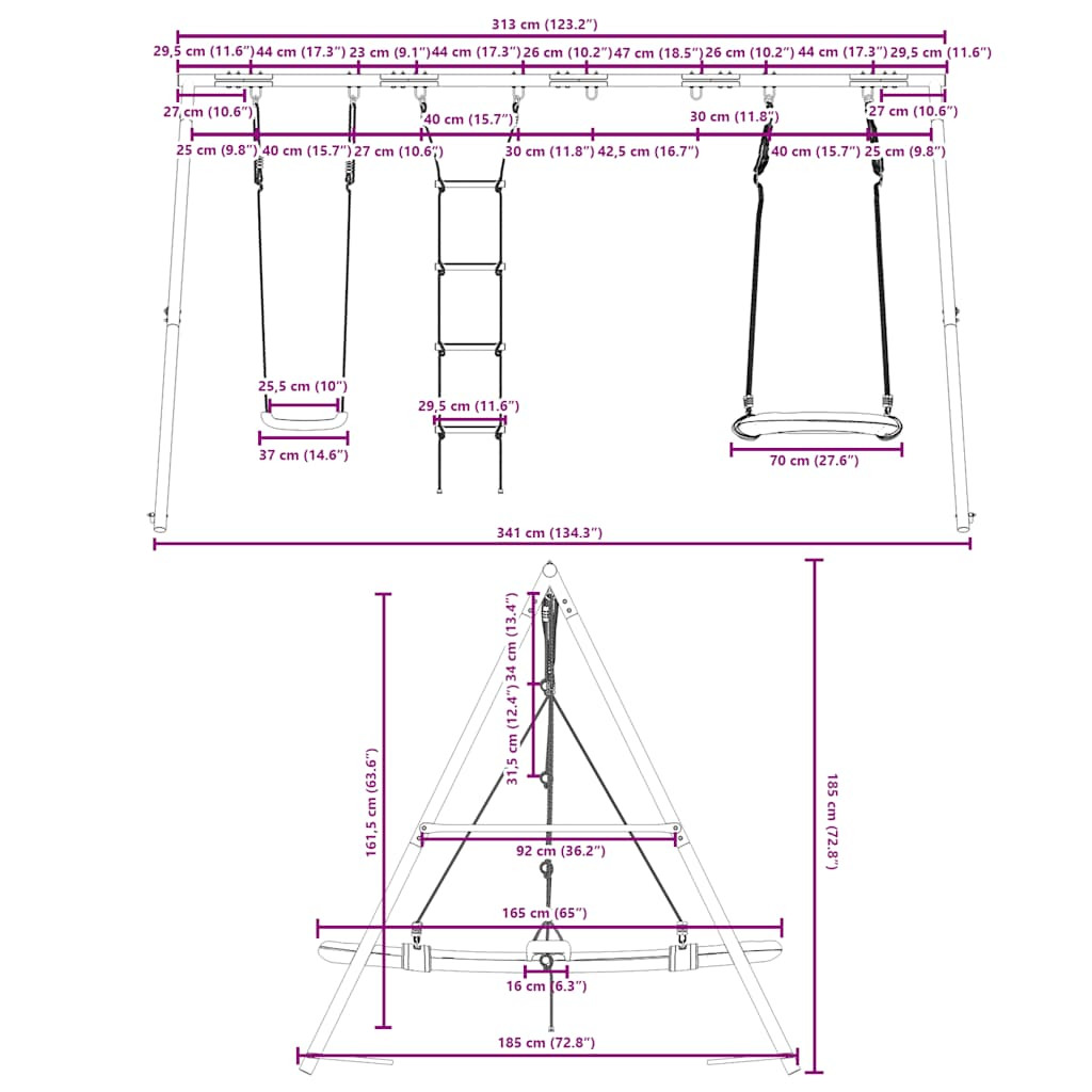 Varázsolja kertjét gyerekei játszóterévé ezzel a kültéri hinta szettel! Szórakoztató foglalkoztatóközpont: Ez a gyermekhintaszett 3 különböző játéklehetőséget tartalmaz hintaüléssel, mászólétrával és ovális fészekhintával. Így a gyerekek kedvükre hintázhatnak és mászhatnak.Nagy teherbírású fém váz: Ez a hintaváz festett acélcsövekből készült, amelyek rozsdaállók, rendkívül erősek, és ellenállnak a deformációnak, kiváló stabilitást és tartósságot biztosítva. Az A-alakú szerkezet erős támaszt nyújt, ingadozás nélkül.Állítható hintaülés: Ezt a kerti hintát úgy tervezték, hogy gyermekével együtt növekedjen, így kisgyermekek és növekvő gyerekek számára egyaránt alkalmas. A kötélhossz beállításával könnyedén alkalmazkodhat gyermeke változó igényeihez.Multifunkcionális szabadtéri játékok gyerekeknek: Ez a kerti hinta szett segít a gyerekeknek fejleszteni egyensúlyukat, koordinációjukat, mozgékonyságukat, erejüket, és állóképességüket, miközben változatos játék- és testmozgást biztosít.Széleskörű felhasználás: Ez a hintaváz különféle helyeken helyezhető el, például kertben, hátsó udvaron, óvodában, játszótéren stb. Jó tudni:A biztonság kedvéért ügyeljen arra, hogy a hinta egyszerre csak egy gyermek számára legyen elérhető. Figyelem. 3 év alatti gyermekek számára nem alkalmas. Csak háztartási használatra.