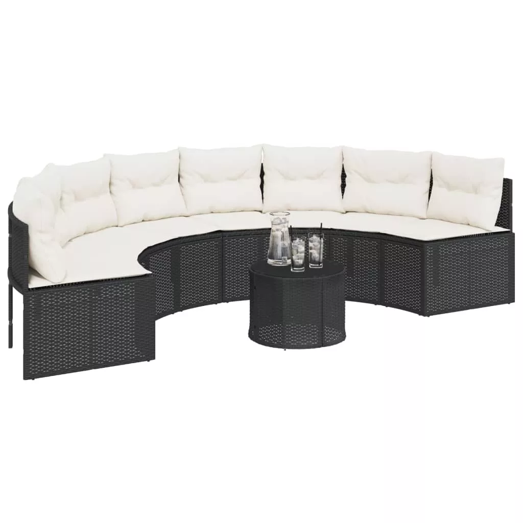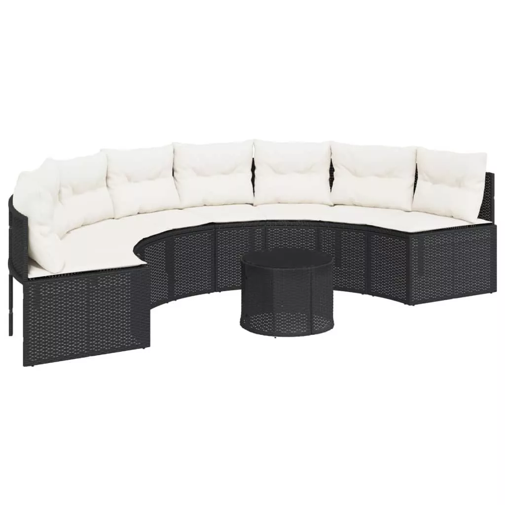fekete polirattan félkör kerti kanapé asztallal és párnákkal