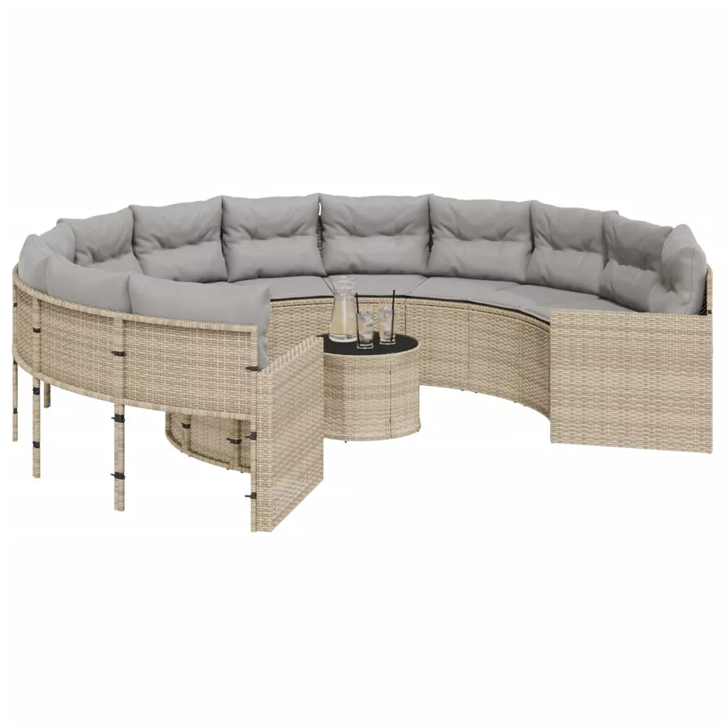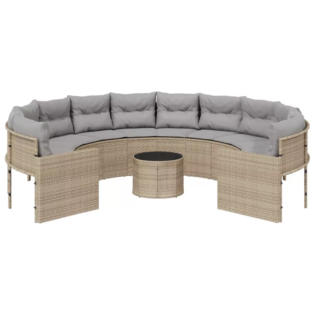 bézs polirattan kerek kerti kanapé asztallal és párnákkal