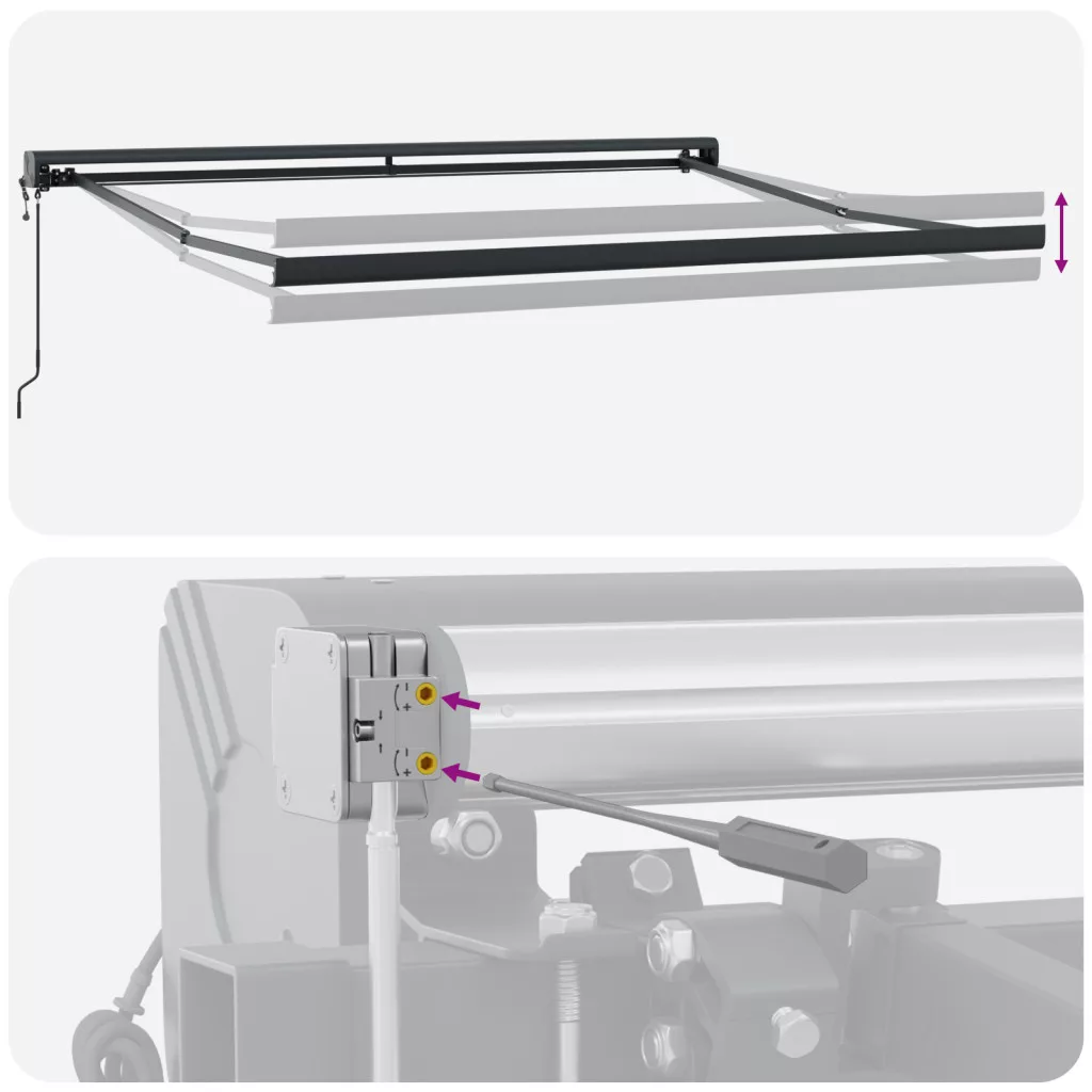 Díszítsd fel a kültéri területed a vidaXL Automatikus behúzható napellenzőjével. Nemcsak fantasztikus napvédelmet ad, de szebbé is teszi a házad külsejét. Ez a napellenző tartós, vízlepergető anyagból és elegáns matt felületből készült, így remekül illik bármely teraszhoz, erkélyhez vagy kerthez. Ez a készülék 8 éves vagy annál idősebb gyermekek, valamint csökkent fizikai, érzékszervi vagy mentális képességekkel rendelkező személyek, vagy tapasztalatlanok és tudás híján lévők számára is használható, ha megfelelő felügyeletet kaptak, vagy útmutatást kaptak a készülék biztonságos használatáról, és megértik a vele járó veszélyeket. A gyermekek nem játszhatnak a készülékkel. A tisztítást és karbantartást a gyermekek nem végezhetik felügyelet nélkül. Ha a tápkábel sérült, azt a gyártónak, annak szervizügynökének vagy hasonlóan képzett személynek kell kicserélnie, hogy elkerülje a veszélyeket. FIGYELEM: Fontos biztonsági utasítások. Az emberek biztonsága érdekében fontos, hogy kövessük ezeket az utasításokat. Őrizze meg ezeket az utasításokat. FIGYELEM: Fontos biztonsági utasítások. Kövesse az összes utasítást, mivel a helytelen telepítés súlyos sérüléshez vagy akár halálhoz vezethet. Ne engedje, hogy gyermekek játsszanak a vezérlő eszközzel. Tartsa a távirányítót távol a gyermekektől. Ne működtesse a napernyőt, miközben karbantartást, például ablakmosást végeznek a közelben. A meghajtó mozgó alkatrészeit legalább 2,5 m magasságban kell telepíteni a padlóról, vagy más olyan szinten, amely hozzáférést biztosíthat hozzájuk. A meghajtó telepítése előtt távolítsa el az összes felesleges vezetéket, és kapcsolja ki azokat az eszközöket, amelyek nem szükségesek a működtetéshez. Az eltorzított kikapcsoló kapcsoló működtető eleme közvetlen látótávolságon belül legyen a meghajtott részhez, de távol a mozgó alkatrészektől. Minimum 1,5 m magasságban kell telepíteni.Veszély! Kinyitáskor a rugó erősen kipattan. NE távolítsa el a kötelet addig, amíg az összes összeszerelési lépést be nem fejezte, az összes csavart nem rögzítette és az elem nincs a falhoz rögzítve! Figyelem! Legyen óvatos a karok kilazításakor, mert azok feszültség alatt állnak! Az összecsukható kar hirtelen kiengedése sérülést okozhat. Figyelmeztetés: A termék használata előtt el kell olvasni a használati útmutatót. Figyelem: A fagyos körülmények között történő használat kárt tehet a termékben. Külső felhasználás épületeknél és egyéb építkezéseknél.
