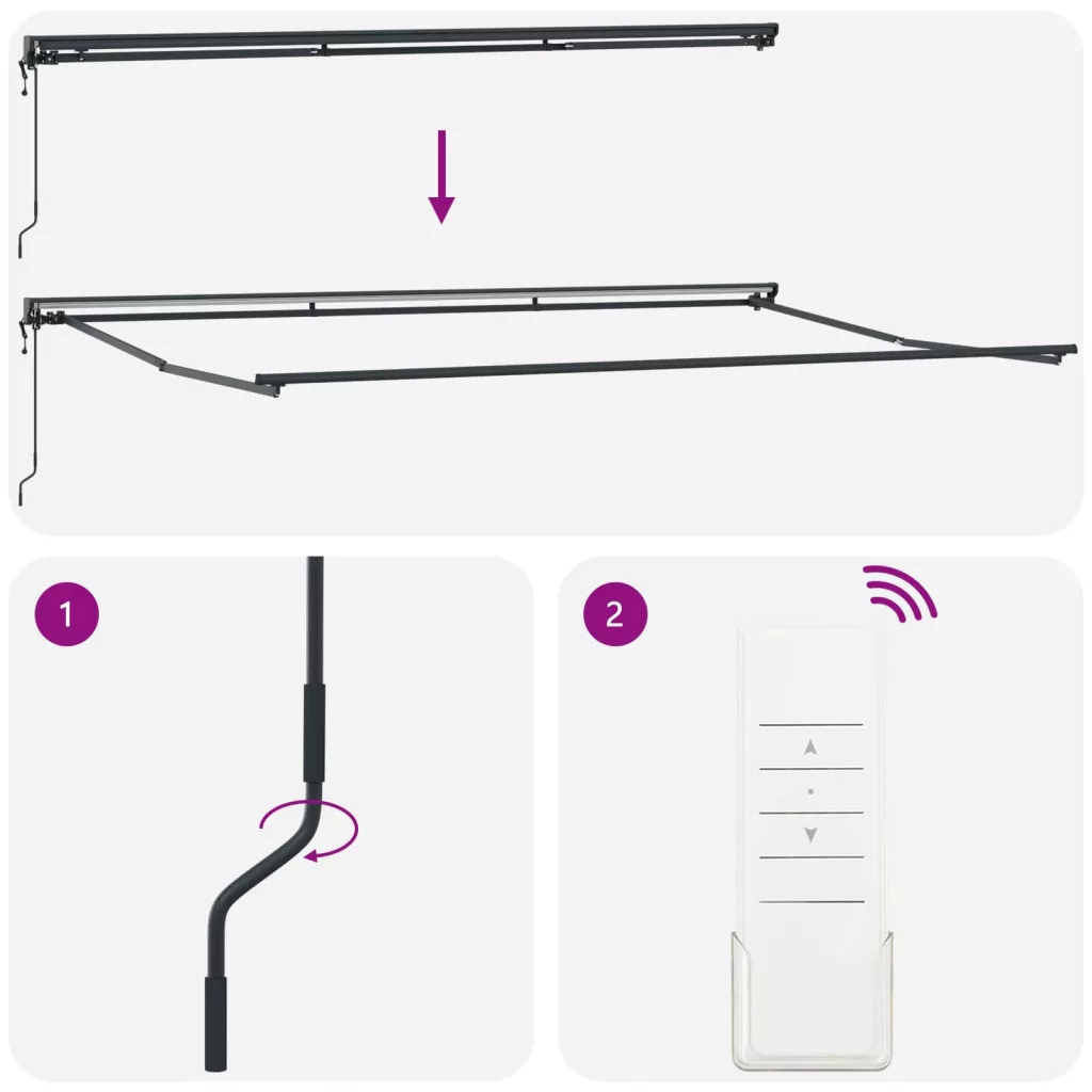 Ez a behúzható napellenző praktikus árnyékot nyújt a kültéri helyiségeknek, mint kertek és teraszok. Könnyen kihúzható vagy behúzható, szóval simán állíthatod, mennyi napfényre vagy árnyékra van szükséged. Remek választás tevékenységekhez, mint a kerti étkezés, pihenés vagy vendégfogadás, hiszen kellemes környezetet teremt, védelmet adva a nap és az enyhe eső ellen. A napellenző tökéletes eszköz a kültéri helyek maximális kihasználásához egész évben. Hordozható anyagok: Poliészter szövetből készült, PU bevonatú, ami segít ellenállni az időjárás viszontagságainak. A porbevonatos acél és alumínium keret stabilitást nyújt a mindennapi kültéri használathoz. Állítható működés: A napellenző működtethető manuális kurblával vagy elektromos távirányítóval, így könnyedén kihúzhatod vagy behúzhatod, attól függően, mennyi árnyékra van szükséged. Semi-Cassette dizájn: Behúzható karok és alumínium hengert tartalmaz, ami sima kihúzást és behúzást biztosít, míg megóvja a szövetet, ha nem használod. Kültéri árnyék: Kiváló teraszon, kertekben és teraszokon - a behúzható funkcionalitás lehetővé teszi, hogy az árnyék területe a napfényviszonyoknak megfelelően állítható legyen. Telepítési követelmények: A napellenzőt falra kell szerelni. Alapvető eszközökre, mint csavarhúzó, fúró és fogó lesz szükséged. Kövesd a mellékelt utasításokat a megfelelő összeszereléshez és stabil telepítéshez.