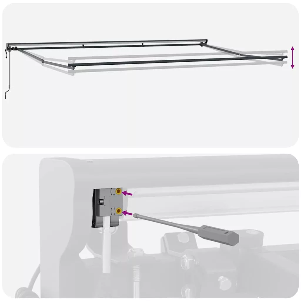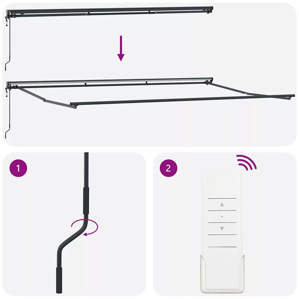 Ez a behúzható napellenző praktikus árnyékot nyújt a kültéri helyiségeknek, mint kertek és teraszok. Könnyen kihúzható vagy behúzható, szóval simán állíthatod, mennyi napfényre vagy árnyékra van szükséged. Remek választás tevékenységekhez, mint a kerti étkezés, pihenés vagy vendégfogadás, hiszen kellemes környezetet teremt, védelmet adva a nap és az enyhe eső ellen. A napellenző tökéletes eszköz a kültéri helyek maximális kihasználásához egész évben. Hordozható anyagok: Poliészter szövetből készült, PU bevonatú, ami segít ellenállni az időjárás viszontagságainak. A porbevonatos acél és alumínium keret stabilitást nyújt a mindennapi kültéri használathoz. Állítható működés: A napellenző működtethető manuális kurblával vagy elektromos távirányítóval, így könnyedén kihúzhatod vagy behúzhatod, attól függően, mennyi árnyékra van szükséged. Semi-Cassette dizájn: Behúzható karok és alumínium hengert tartalmaz, ami sima kihúzást és behúzást biztosít, míg megóvja a szövetet, ha nem használod. Kültéri árnyék: Kiváló teraszon, kertekben és teraszokon - a behúzható funkcionalitás lehetővé teszi, hogy az árnyék területe a napfényviszonyoknak megfelelően állítható legyen. Telepítési követelmények: A napellenzőt falra kell szerelni. Alapvető eszközökre, mint csavarhúzó, fúró és fogó lesz szükséged. Kövesd a mellékelt utasításokat a megfelelő összeszereléshez és stabil telepítéshez. Veszély! Kinyitáskor a rugó erősen kipattan. NE távolítsa el a kötelet addig, amíg az összes összeszerelési lépést be nem fejezte, az összes csavart nem rögzítette és az elem nincs a falhoz rögzítve! Figyelem! Legyen óvatos a karok kilazításakor, mert azok feszültség alatt állnak! Az összecsukható kar hirtelen kiengedése sérülést okozhat. Figyelmeztetés: A termék használata előtt el kell olvasni a használati útmutatót. Figyelem: A fagyos körülmények között történő használat kárt tehet a termékben. Külső felhasználás épületeknél és egyéb építkezéseknél. Ne engedje, hogy a gyerekek a redőny vezérlőeszközével játszanak. Tartsa a távirányítót távol a gyermekektől.