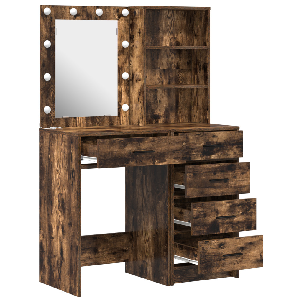 2 darabos Öltöztetőasztal szett LED világítással, füstölt tölgy kompozit fa