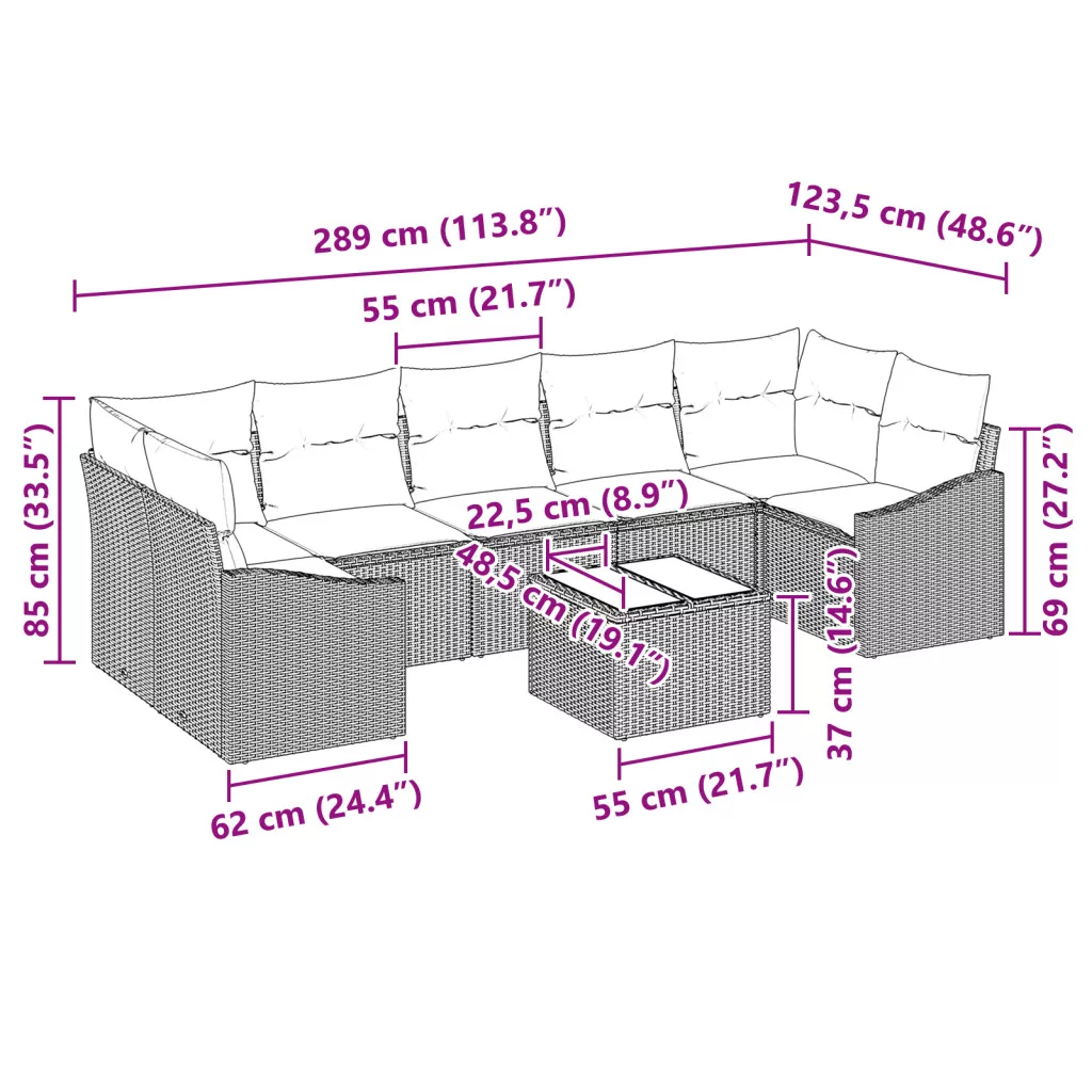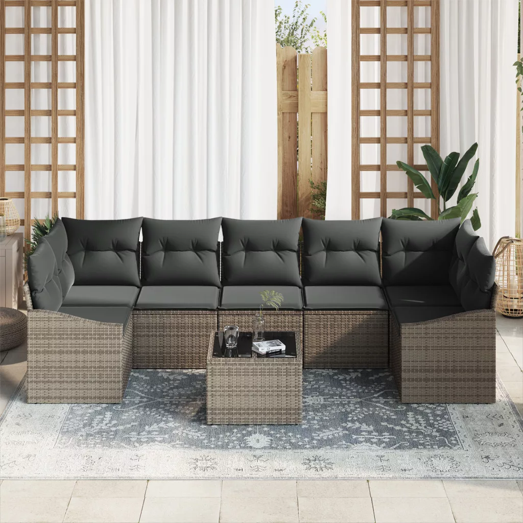 Ez a 8 darabos kerti kanapé szett a kültéri stílusod fejlesztésére lett kitalálva. Akár hét embert is elhelyezhetsz rajta, így szuper választás családi összejövetelhez vagy grillezéshez. Modern dizájn: Szürke poli rattan és szürke párnák friss megjelenést kölcsönöznek, ami feldobja a kültéri teret. Erős felépítés: Időjárásálló anyagokból készült, így a kanapé szett ellenáll az időjárás viszontagságainak, miközben megőrzi a stílusát. Szuper kényelmes: A habbal töltött párnák puha ülést biztosítanak, így a kültéri pihenések kellemesek lesznek. Rugalmas elrendezés: A moduláris dizájn lehetővé teszi, hogy különböző módon állítsd össze, hogy a térbeli igényeidnek legjobban megfeleljen. Könnyű ápolás: Csak töröld le a párnákat és a rattan felületeket egy nedves ruhával, hogy a szett mindig jól nézzen ki. Rossz időjárás esetén tárold a párnákat beltérben.