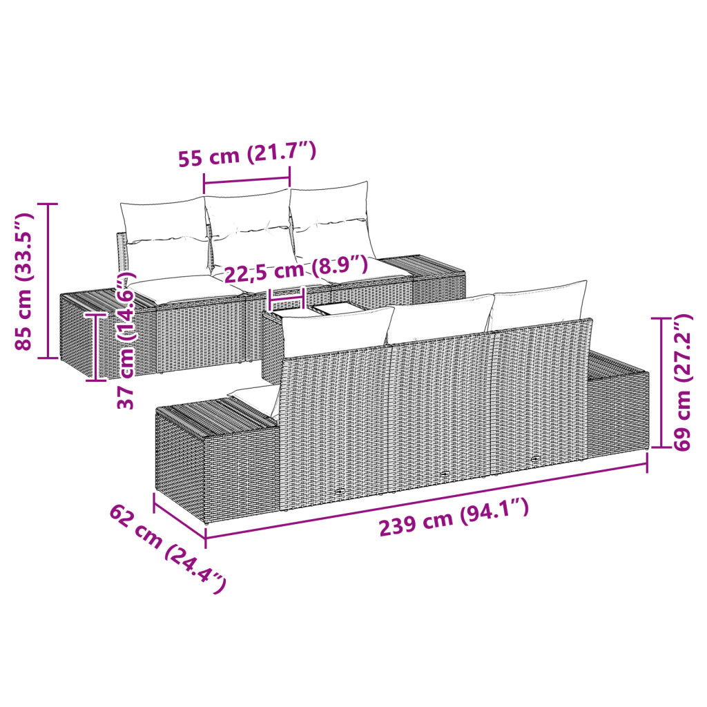 Ez a 7 részes kerti kanapé készlet modern megjelenésével tökéletes kültéri összejövetelekhez. Tartós fekete poli rattanból készült és kényelmes, levehető párnákkal bír, ami ideális hosszú pihenésekhez, feldobva bármelyik erkélyt vagy teraszt. Moduláris dizájn: Változtasd meg a kültéri elrendezést moduláris dizájnjával, amit könnyen átrendezhetsz. Tökéletes különböző alkalmakra, legyen szó családi összejövetelről vagy csendes estéről a haverokkal. Kényelmes ülőhely: Minden elem vastag, puha dobozos párnákkal van ellátva, amelyek időjárásálló poliészterből készültek, így garantált a kényelmes pihenés. Imádni fogod, ahogy belemerülsz ezekbe a vonzó párnákba. Időjárásálló: UV-álló poli rattanból készült, ez a kültéri kanapé készlet bírja az időjárást, megőrzi a szép megjelenését. Nem kell többé aggódnod a fakulás miatt, amíg egész évben élvezheted ezt a készletet. Bővített kapacitás: Akár 6 fő is kényelmes elhelyezésére alkalmas, ez a kanapé készlet remek társas összejövetelekhez, családi vacsorákhoz vagy lazítós napokhoz. A tágas elrendezés mindenkit szívesen lát. Könnyű karbantartás: Ennek a kanapé készletnek a tisztán tartása egyszerű; csak töröld le nedves ruhával. Tartsd a párnákat bent, ha csúnya idő van, így tovább bírják.