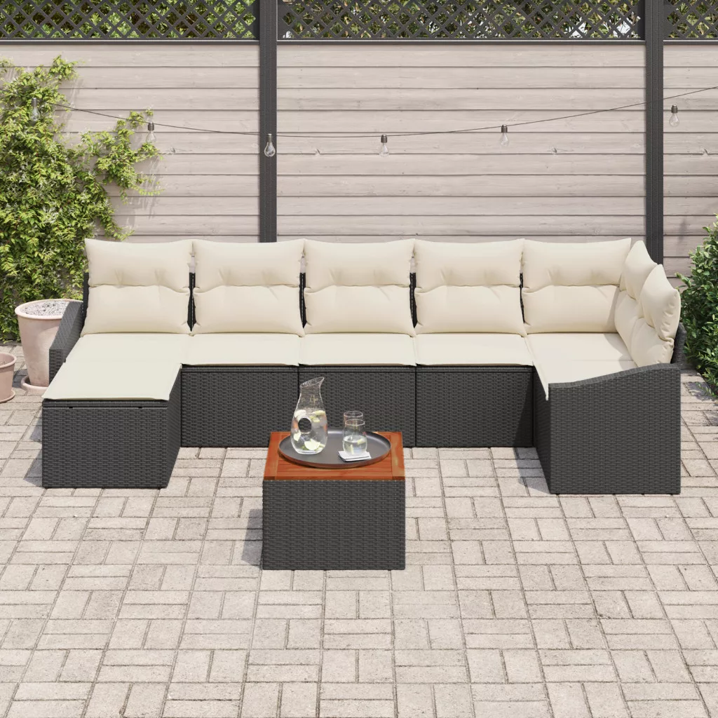 8 Részes Kerti Kanapé Szett Párnákkal Fekete Poli Rattan Akác