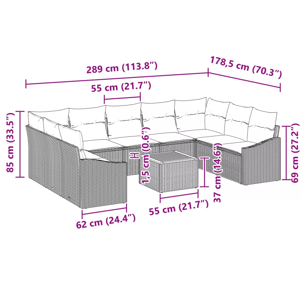 10 Darabos Kerti Kanapé Szett Párnákkal, Fekete Poli Rattan és Akácfa