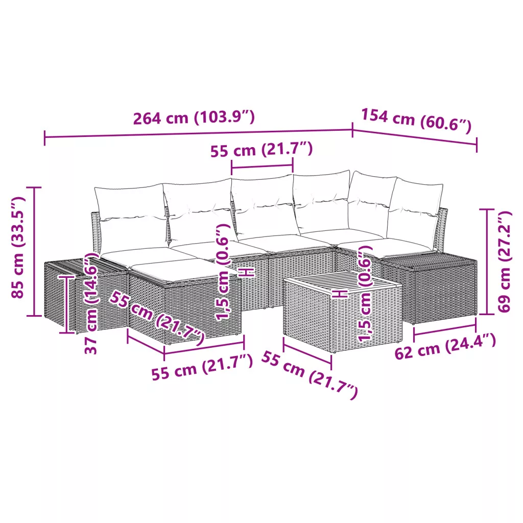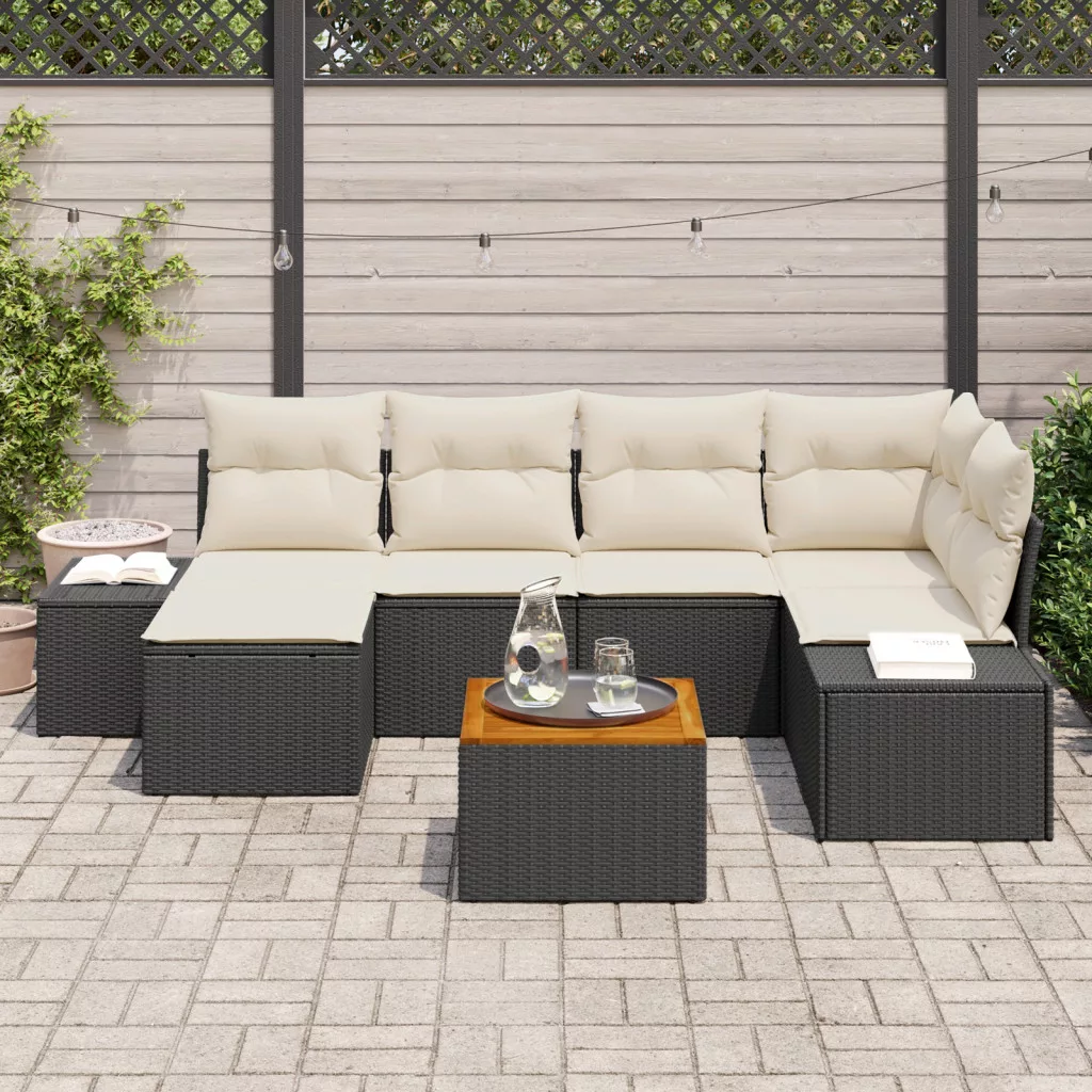 7 részes Kerti Kanapé Szett Párnákkal Fekete Poli Rattan Akáciából