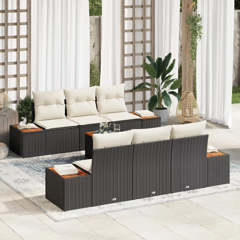 7 Darabos Kerti Kanapé Szett Párnákkal Fekete Polirattan Akác