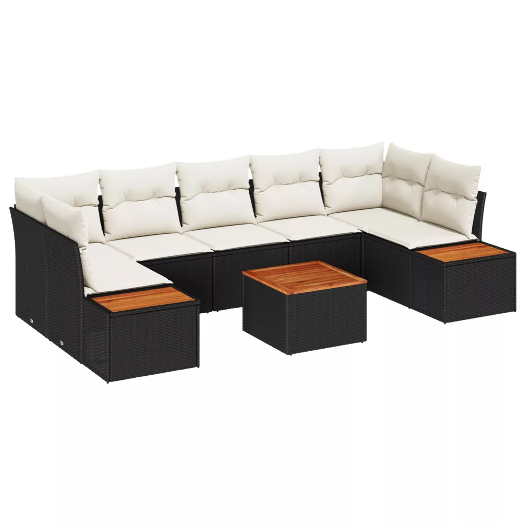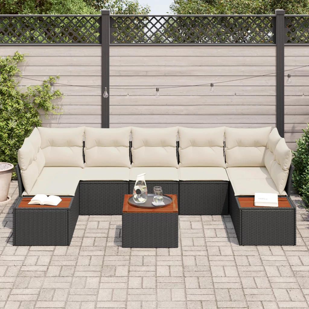 8 Darabos Kerti Kanapé Szett Párnákkal Fekete Polirattan Akáciával