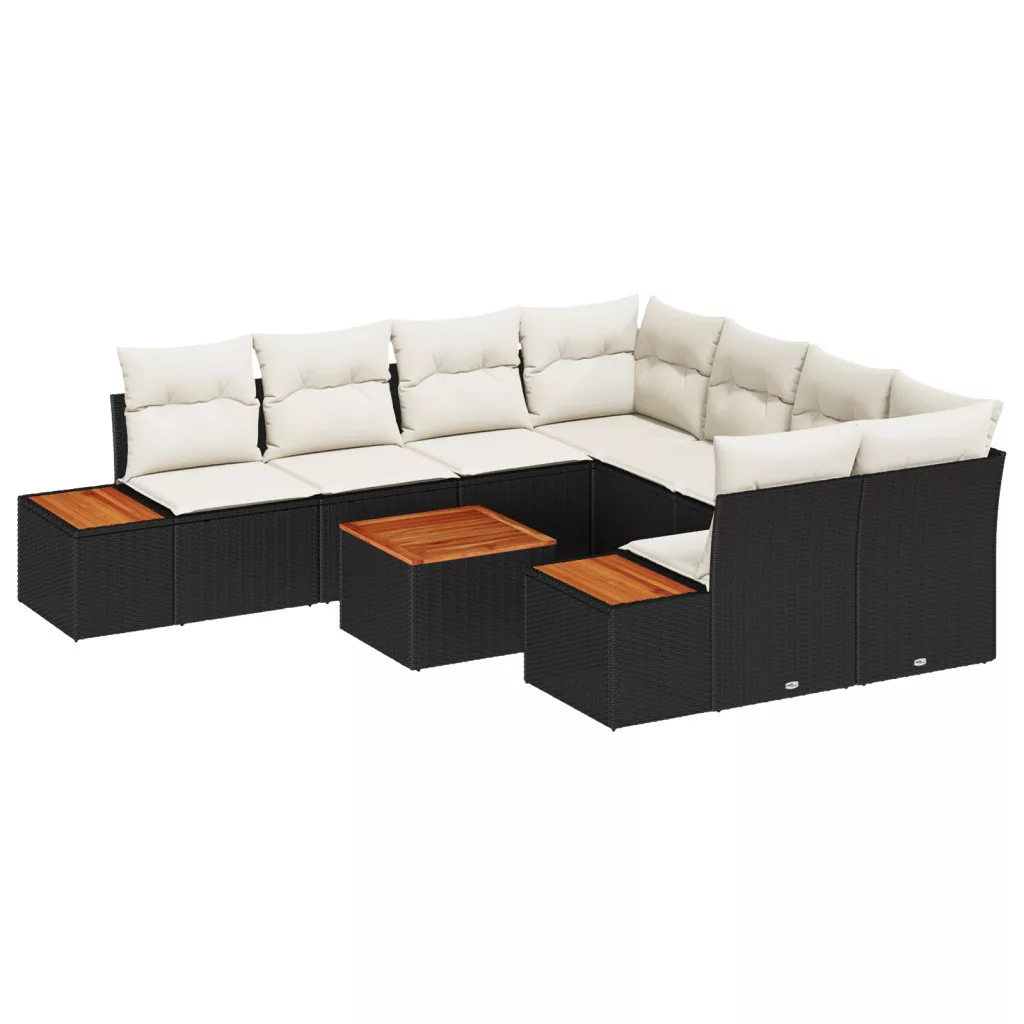 9 Darabos Kerti Kanapé Szett Párnákkal Fekete Polirattan Akácia