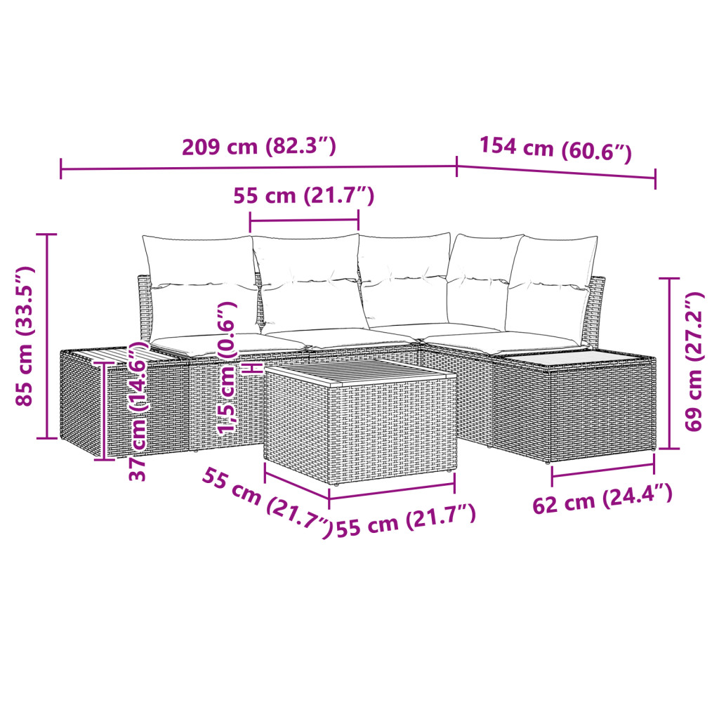 5 darabos Kerti Kanapé Szett Párnákkal Szürke Poli Rattan Akácfa