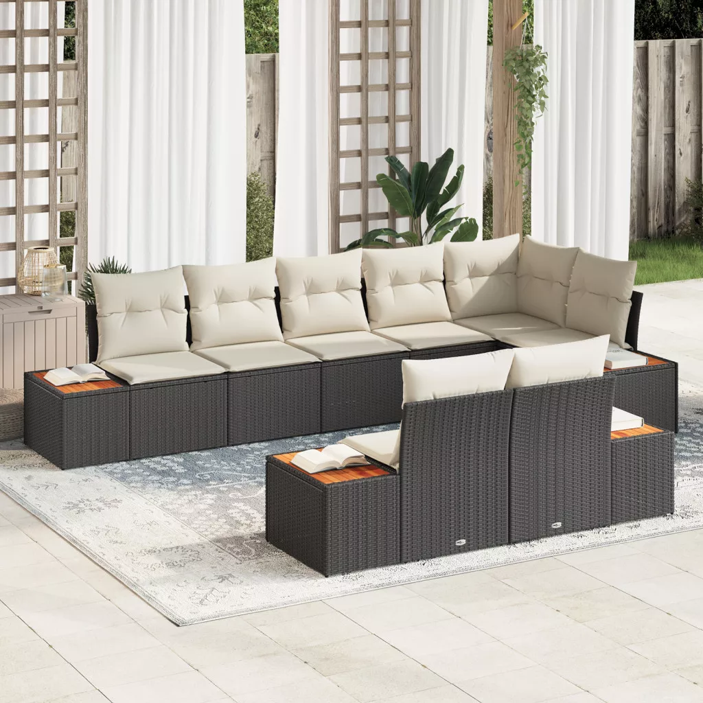 8 részes kertibútor szett párnákkal - Fekete polirattan és akácia