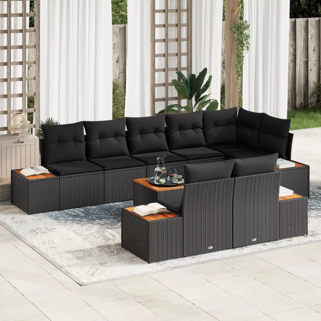 9 Részes Kerti Kanapé Szett Párnákkal - Fekete Poli Rattan és Akác