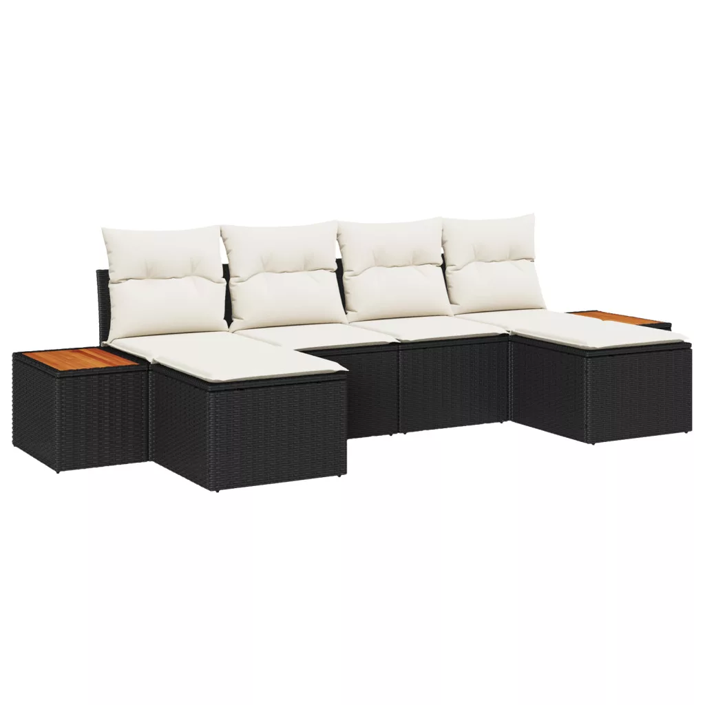 6 Részes Kert Kanapé Szett Párnákkal Fekete Poli Rattan Akácia