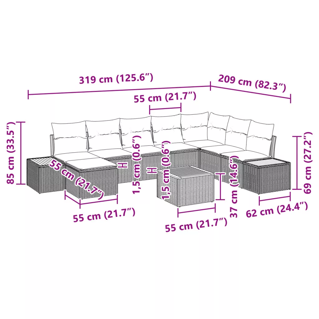 Szállítás tartalma: 4 x Középső ülés tároló funkcióval, 1 x Sarok ülés tároló funkcióval, 2 x Kanapé tároló funkcióval, 1 x Lábtartó tároló funkcióval, 1 x Kerti asztal