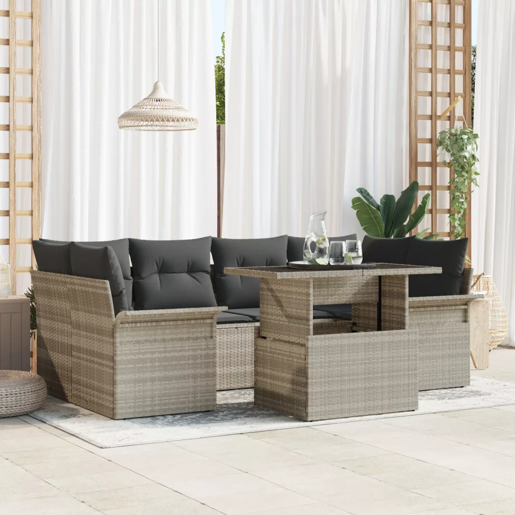 7 Részes Kerti Kanapé Szett Párnákkal Világosszürke Poli Rattan