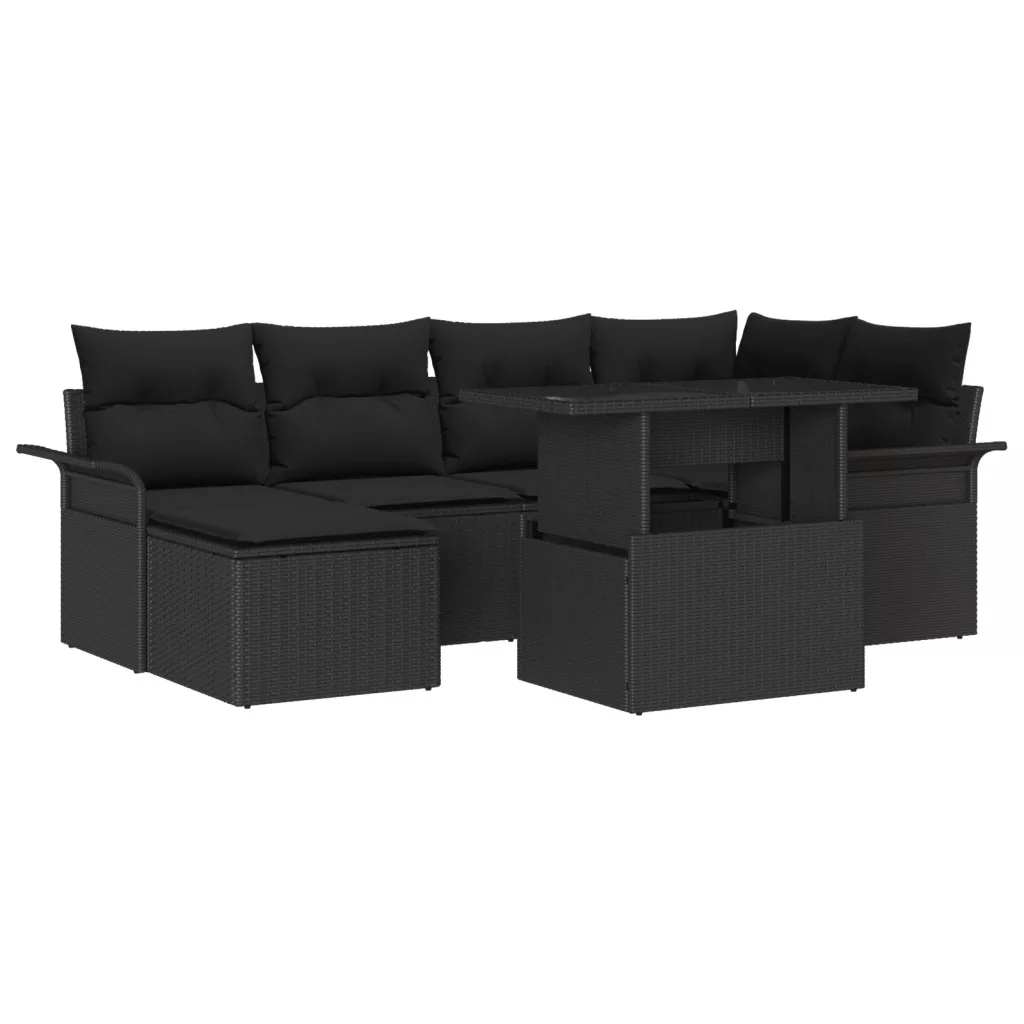 7 darabos Kerti Kanapé Szett Párnákkal Fekete Poli Rattan