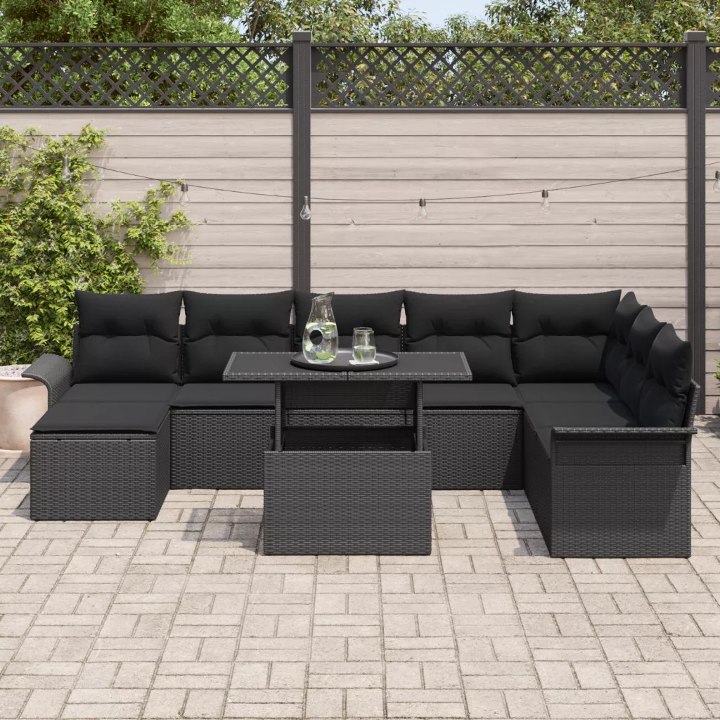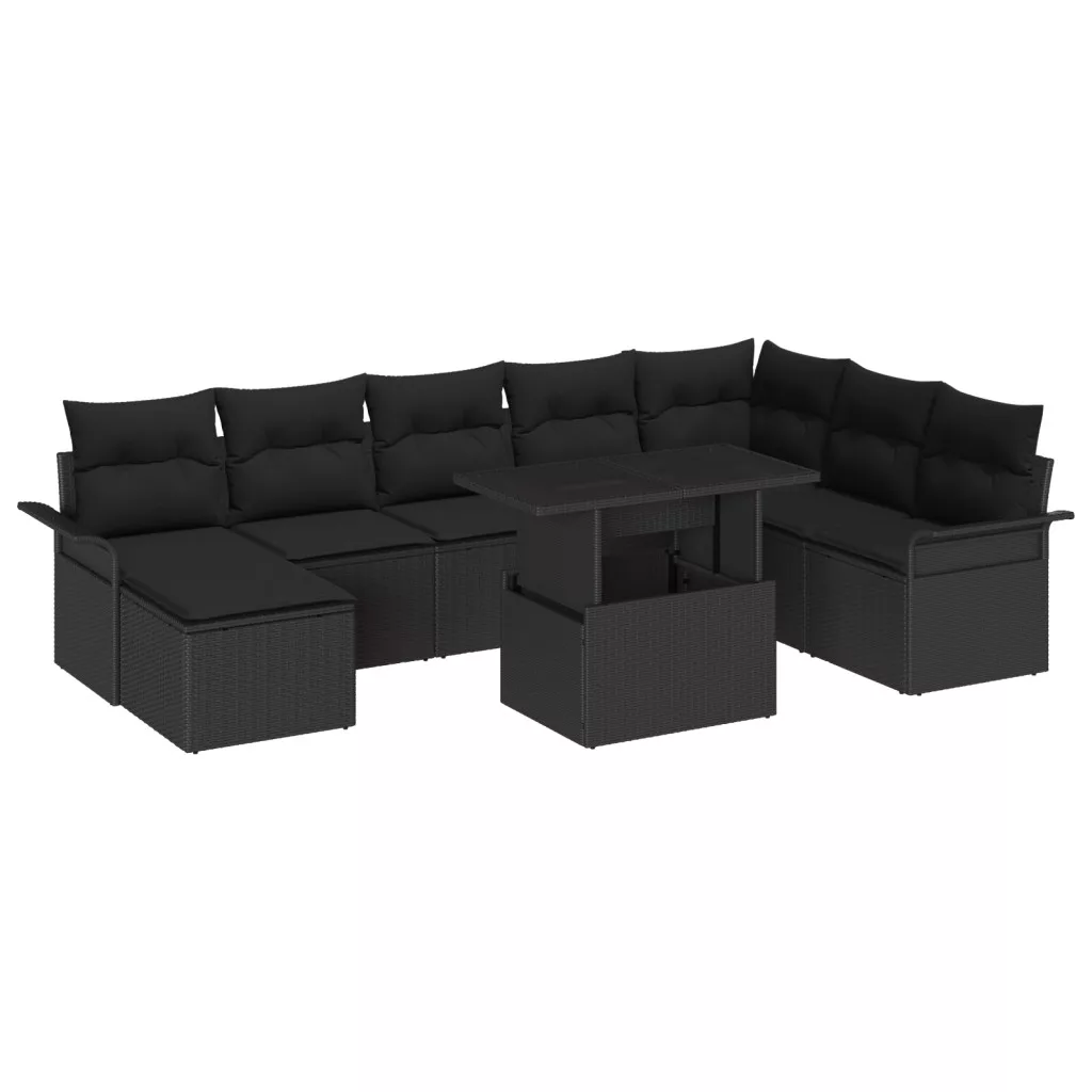 9 Darabos Kerti Kanapé Szett Párnákkal Fekete Poli Rattan