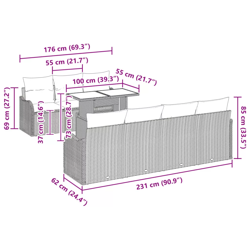 Ez a 8 darabos moduláris kerti kanapészett világosszürke színben stílusos és tökéletes kültéri pihenéshez. A szürke és fekete kombináció modern, erős anyagokkal készült, ideális rendezvényekhez vagy egyszerű lazításhoz. Tágas ülőhely: Kényelmesen elfér akár 6 ember, tökéletes nagy összejövetelekhez. Tartós anyagok: Természetes rattán készült, kültéren tartós. Stílusos dizájn: Modern megjelenés, ami jól illeszkedik a kültéri dekorációhoz. Könnyű karbantartás: A párnák levehetők, rejtett cipzárokkal, így könnyen tisztán tarthatók. Sokoldalú használat: Ideális erkélyekhez, teraszokhoz és kertekhez, bármely kültéri élményt javítva.