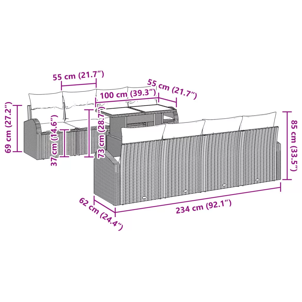 Ez a kerti kanapé szett stílusos ülést kínál a kültéri helyeidhez, könnyen ötvözve a varázst és a kényelmet. Az okos elrendezés ideálissá varázsolja a teraszokat, erkélyeket és kerteket, kellemes helyeket teremtve a lazításhoz vagy a barátok szórakoztatásához. Chic Aesthetic: A klasszikus bézs poli rattan felület varázslatos, amely kiemeli bármely kültéri helyszín vonzerejét, miközben a textúra csak arra vár, hogy megérintsd. Kényelmes Ülés: Minden egyes egység puha poliészterből készült, ami igazán élvezetes ülést kínál. A dobozpárnák erős, de kényelmes támogatást nyújtanak a hosszabb kültéri pihenési időszakokhoz. Robusztus Építés: Természetes rattannal és szintetikus anyagokkal készült, ez a kanapé szett bármilyen időjárásnak ellenáll. Kültéri élvezethez tervezett, így számíthatsz arra, hogy évekig jól fog kinézni. Testreszabható Elrendezés: A moduláris dizájn lehetővé teszi, hogy kedvedre alakítsd, legyen szó akár egy kisebb összejövetelről, akár egy nagyobb eseményről. Alakítsd az igényeidnek megfelelően, hogy a kültéri tered igazán használható legyen. Egyszerű Karbantartás: A levehető párnák cipzáras záródással könnyítik meg a tisztítást, míg a szintetikus rattan felület alacsony karbantartást igényel, így zavartalanul élvezheted a kültéri paradicsomot.