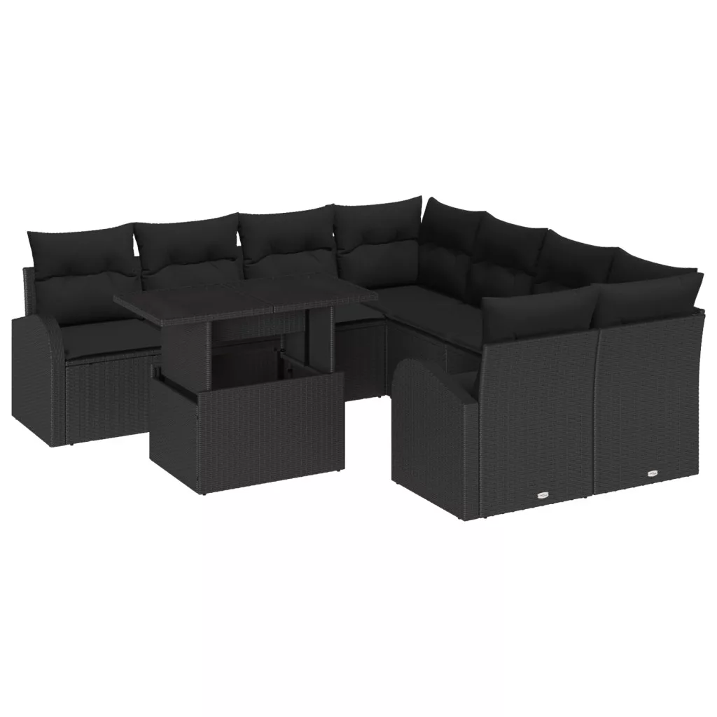 9 Darabos Kerti Kanapé Készlet Párnákkal, Fekete Poli Rattan