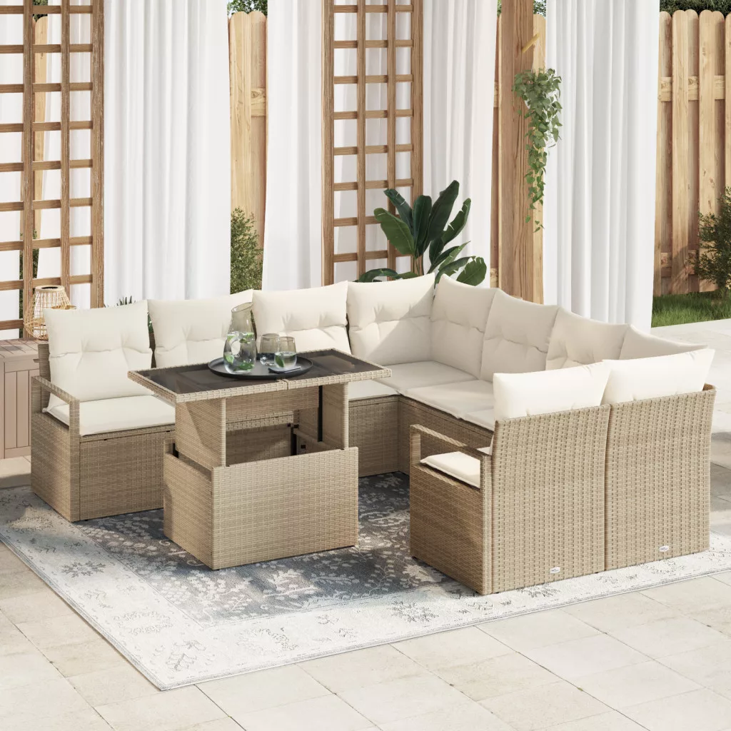 9 Darabos Kert Kanapé Készlet Párnákkal Bézs Poli Rattan