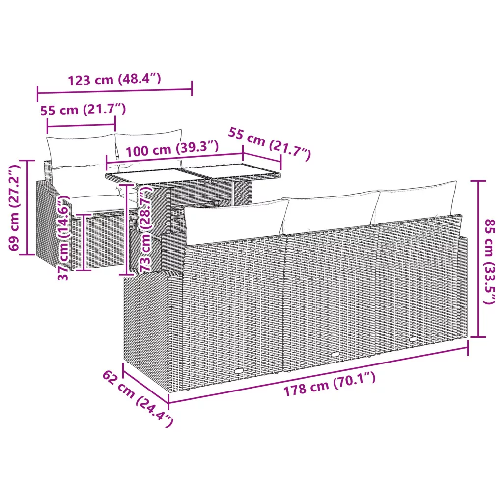 6 részes Kerti Kanapé Szett párnákkal barna poli rattan