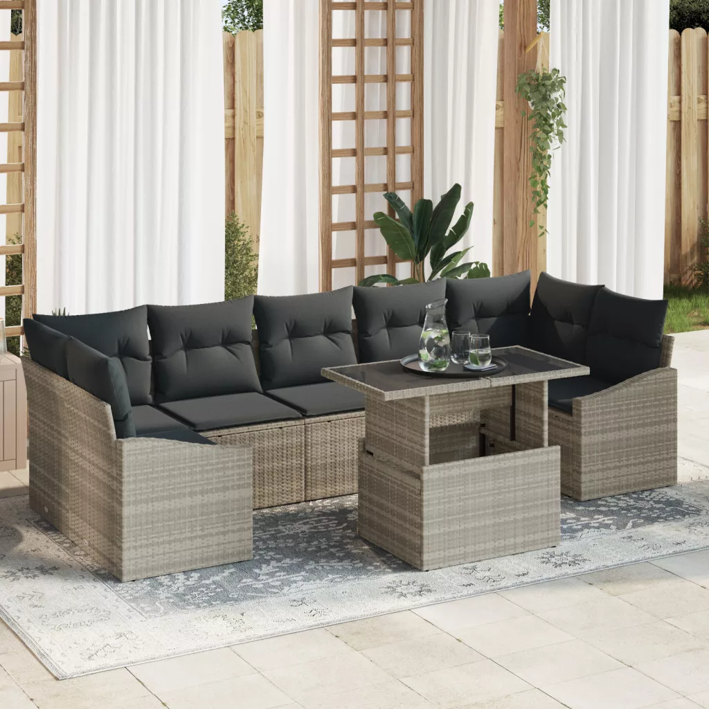 8 darabos kerti kanapé szett párnákkal, világosszürke, polirattan
