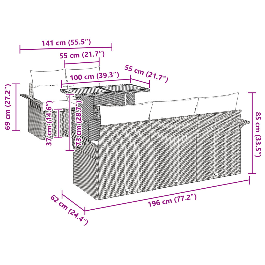 Szállítmány tartalmaz: 4 x Karfa nélküli kanapé, tároló funkcióval, 1 x Középső ülés, tároló funkcióval, 1 x Kerti asztal