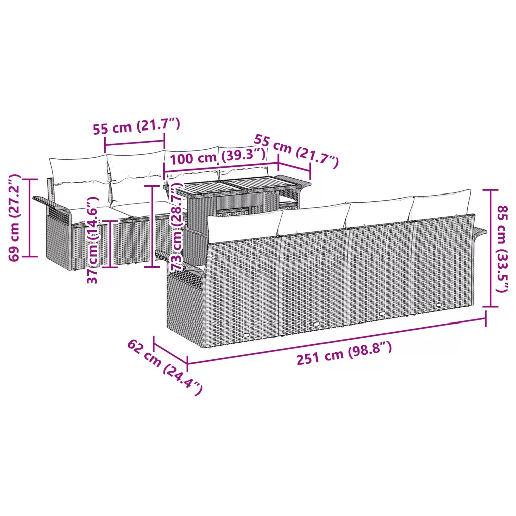 Ez a kerti kanapé szett eleganciát és sokoldalúságot kínál, így ideális kültéri étkezésekhez, lazításhoz vagy baráti összejövetelekhez. Modern dizájnja és sok ülőhelye miatt a kerted vagy teraszod tökéletes hely lesz az összejövetelhez. Moduláris kialakítás: A moduláris kialakításnak köszönhetően könnyedén átrendezheted a bútorokat, bárhol elférnek. Időjárásálló anyag: Erős rattan, ami jól bírja az időjárást, UV álló, így a bútor mindig szép és strapabíró marad. Kényelmes párnák: Vastag habbel töltött párnák, amik nagyon kényelmesek. Levehető és mosható huzattal, így a takarítás gyors és egyszerű. Természetes fa felület: A gyönyörű teak asztallap jól mutat a rattannal, elegáns stílust adva és praktikus is kültéren. Tárolási funkció: Minden darab praktikus tárolóhellyel van ellátva, így minden rendben tartható. Remek megoldás a rendezett kültéri területhez.