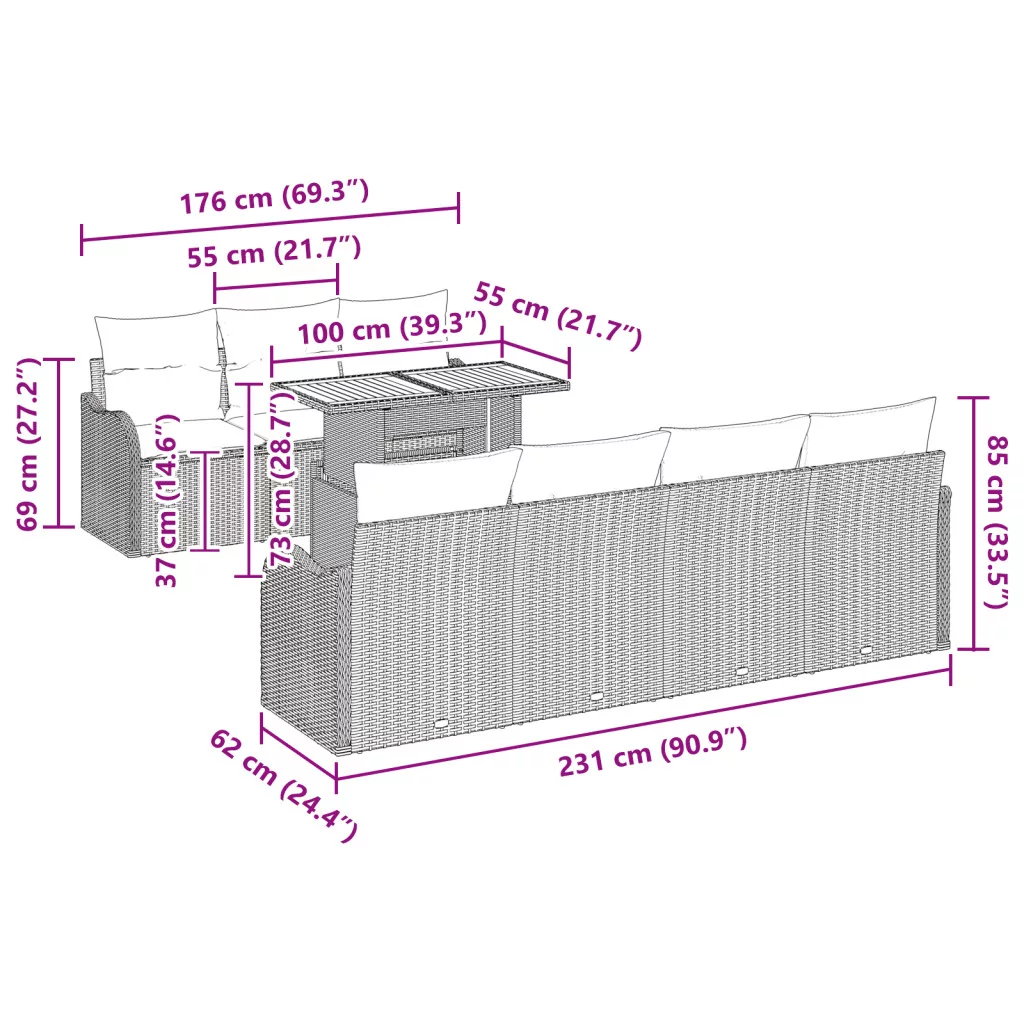 Ez a 8 Részes Kertibútor szett a stílus és praktikum ideális választása bármilyen kültéri térhez. Modern megjelenése és robusztus poli rattan anyaga, együtt a kényelmes párnákkal, kellemes hangulatot teremt, tökéletes társasági eseményekhez vagy lazítós napokhoz. Moduláris rugalmasság: Változtasd meg a kanapé elrendezését, hogy illeszkedjen a helyedhez, akár teraszon, akár balkonon. Készíts kényelmes fészket vagy tágas teret az igényeid szerint, így szuper alkalmazkodó. Ez a kanapé szett maximalizálja a használatot és javítja a kültéri tered összképét. Kényelmes párnák: Minden ülőhelyhez puha, levehető párnák tartoznak, amelyek időjárásálló poliészterből készültek, így hosszú távon kényelmes ülést biztosítanak. A cipzár könnyű karbantartást biztosít, praktikus kültéri környezetben. Élvezd a pihenést vagy a barátok szórakoztatását kényelmes támaszokkal minden irányban. Tartós anyagok: Erős polirattanból és porbevonatú acélvázból készült, ez a kültéri bútor bírja az időjárás viszontagságait anélkül, hogy elveszítené a varázsát. Tudd, hogy a beruházásod megtartja külsejét és erejét hosszú évekig. Dőlj hátra és pihenj, a kanapéd itt marad hosszú időre. Elegáns asztali felület: A kiemelkedő jellemzője a stílusos téglalap alakú fa asztal, ami eleganciát ad a kültéri terednek. Tökéletes italok, snackek vagy dekorációk tartására, a természetes felület jól illik a rattanhoz, így funkcionális és vonzó. Emeld az kültéri étkezést és szórakoztatást könnyedén. Könnyen összeszerelhető: Ez a kertibútor szett könnyen érthető összeszerelési utasításokat és minden szükséges eszközt tartalmaz, két ember szükséges az összeszereléshez, így zökkenőmentesen élvezheted az új pihenő helyedet.