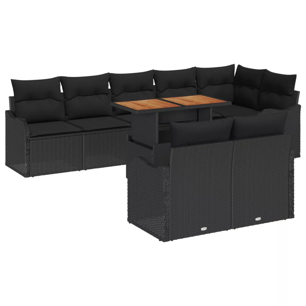 9 darabos Kerti Kanapé Szett Párnákkal Fekete Poli Rattan Akáciából