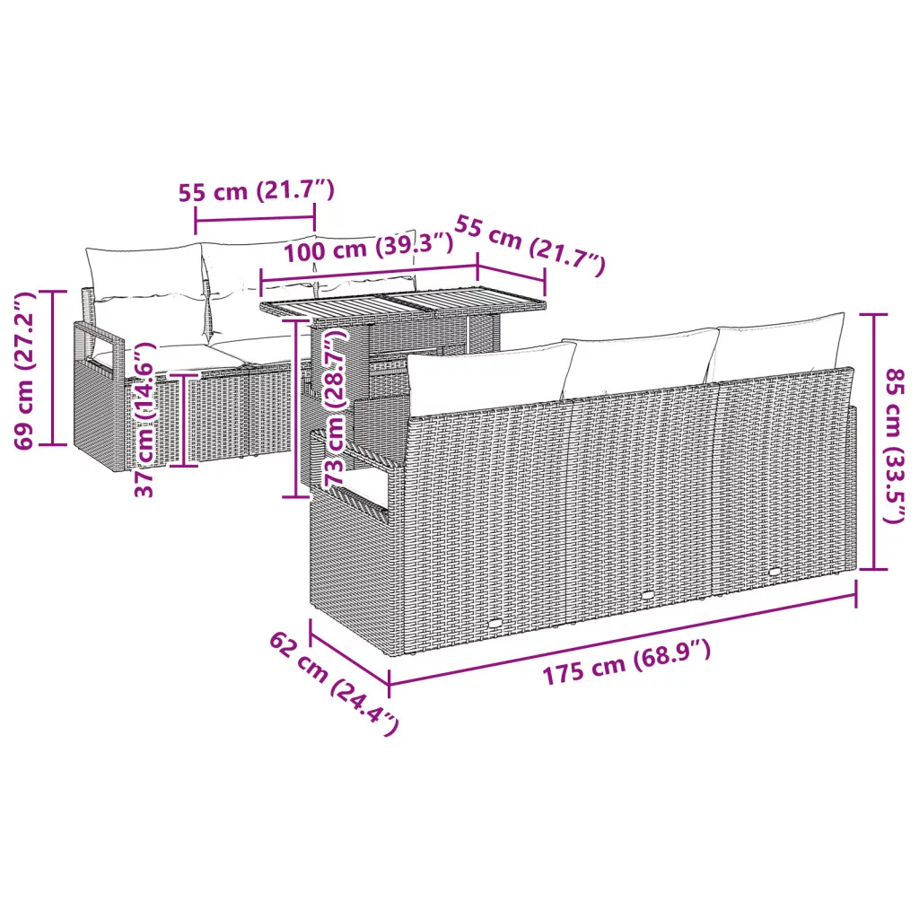 7 darabos kert kanapé szett párnákkal szürke poli rattan akácia