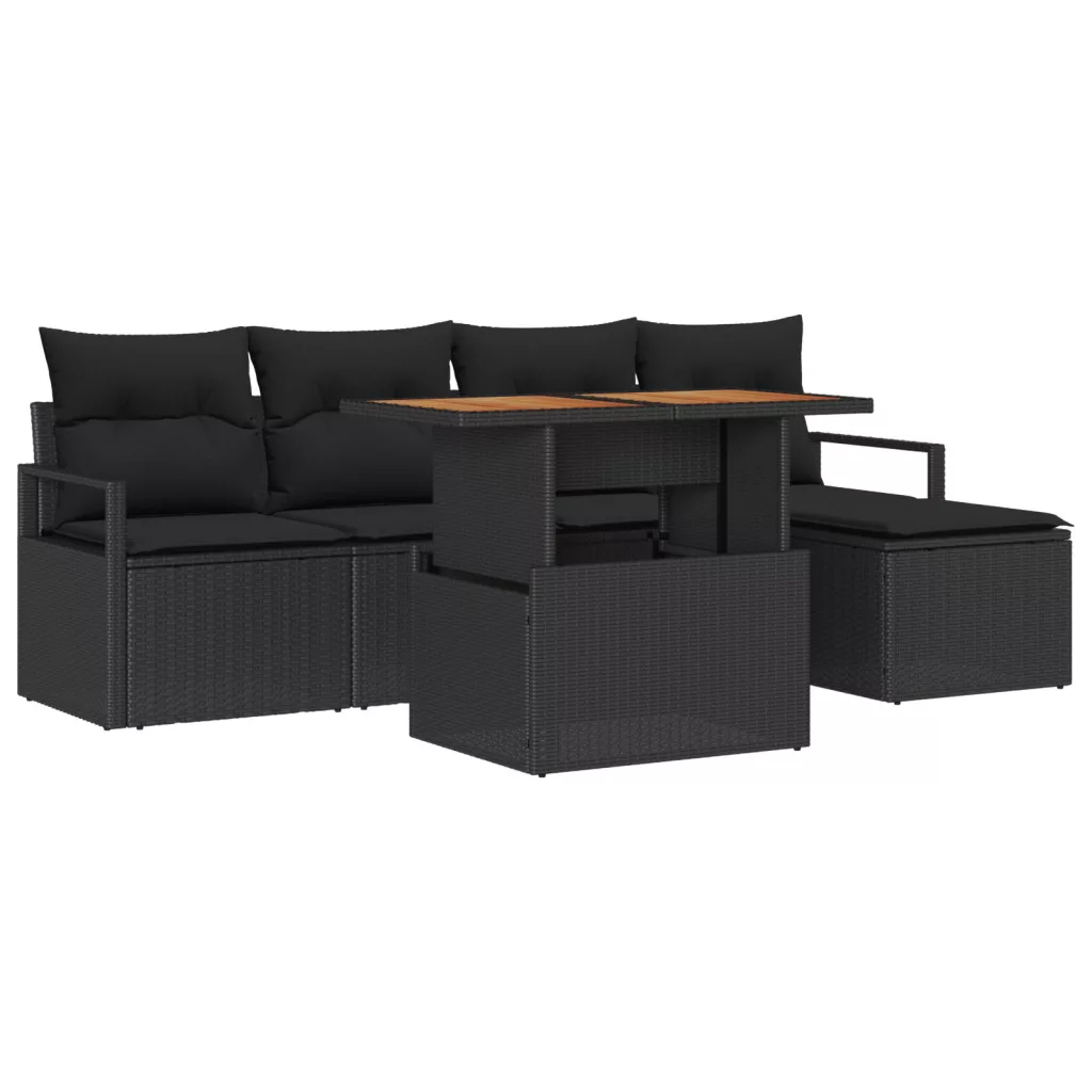 6 Részes Kerti Kanapé Szett Párnákkal Fekete Poli Rattan Akácia