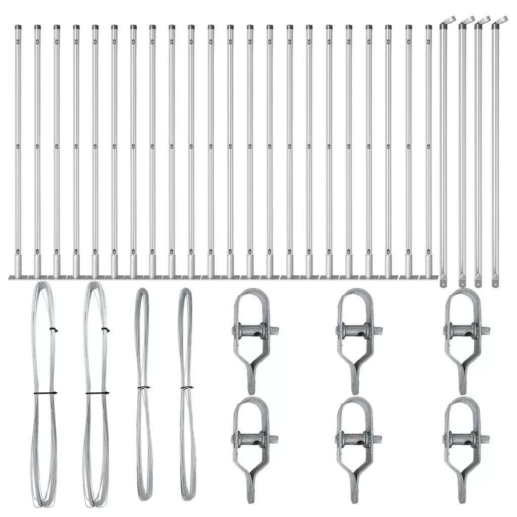 A csomag tartalma: 22 x oszlop, 4 x szögletes oszlop, 22 x alaplemez, 22 x műanyag kupak, 66 x műanyag feszítődrót tartó, 4 x szögletes oszlop kupak, 4 x szögletes oszlop tartozék, 6 x feszítő, 2 x 25 m kötődrót, 2 x 80 m feszítődrót