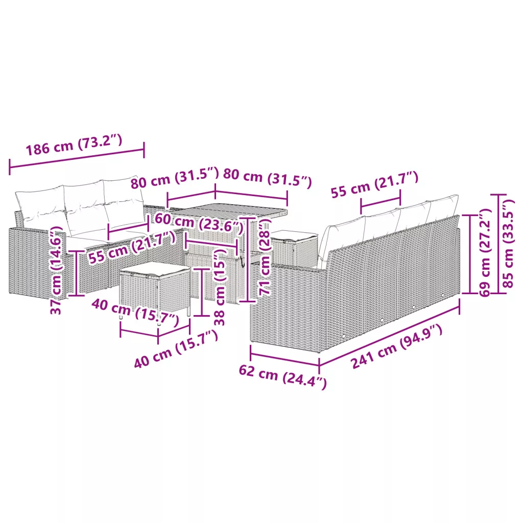 Ez a kert kanapészett feldobja a kültéri stílust a cuki dizájnjával, ami egy szuper kézzel szőtt rattan felületet kínál. Tökéletes nyári bulikhoz vagy csak úgy lazítani, segít megteremteni a kényelmes pihenőhelyet a teraszodon vagy erkélyeden, kellemes párnákkal és masszív felépítéssel. Variálható moduláris dizájn: A szögletes elrendezés lehetővé teszi, hogy variáld a kanapét és a kávézóasztalt, hogy illeszkedjen a kültéri helyedhez. Tökéletes csendes estékhez vagy nagy találkozókhoz. Kényelem stílussal: A tíz puha párnával a szett barátságos és kényelmes ülőhelyet biztosít. A bézs és világosszürke színkombináció bármilyen kültéri dekorba jól illeszkedik, barátságos érzetet teremtve. Tartós anyagok: Az időjárásálló szintetikus poli rattanból és poliészterből készült, ez a szett bírja a kültéri körülményeket, tartós szépséget és kényelmet biztosítva. Évről évre élvezd bármiféle kopástól való stressz nélkül. Könnyű karbantartás: A párnák eltávolítható borítással rendelkeznek, tehát a takarítás egyszerű. Csak söpörd le a port, amikor száraz, és töröld le a foltokat egy nedves ruhával, hogy a bútorod mindig szuper és friss legyen. Tökéletes találkozókhoz: Hat fő számára kényelmes ülőhellyel ez a szett ideális családi összejövetelekhez, kültéri étkezésekhez vagy csak a napsütés élvezéséhez. Használj ki minden pillanatot a kültéri helyeden barátokkal és családdal.