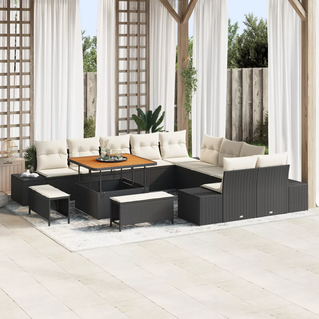 13 részes kerti kanapé szett párnákkal fekete poli rattan akáccal
